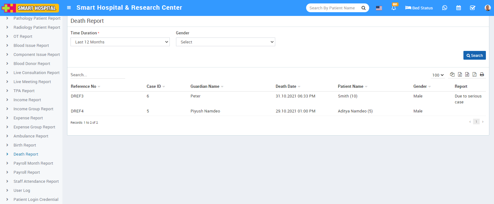 To check Death report, go to Reports > Death Report. Here select the Time Duration and Gender then click on Search button. Here you can see Death details like Reference Number, Case Id, Guardian Name, Patient Name, Gender, Death Date, Report etc. Also you can download this report as PDF.