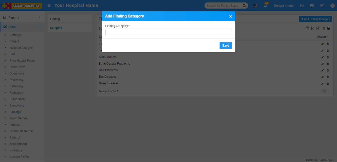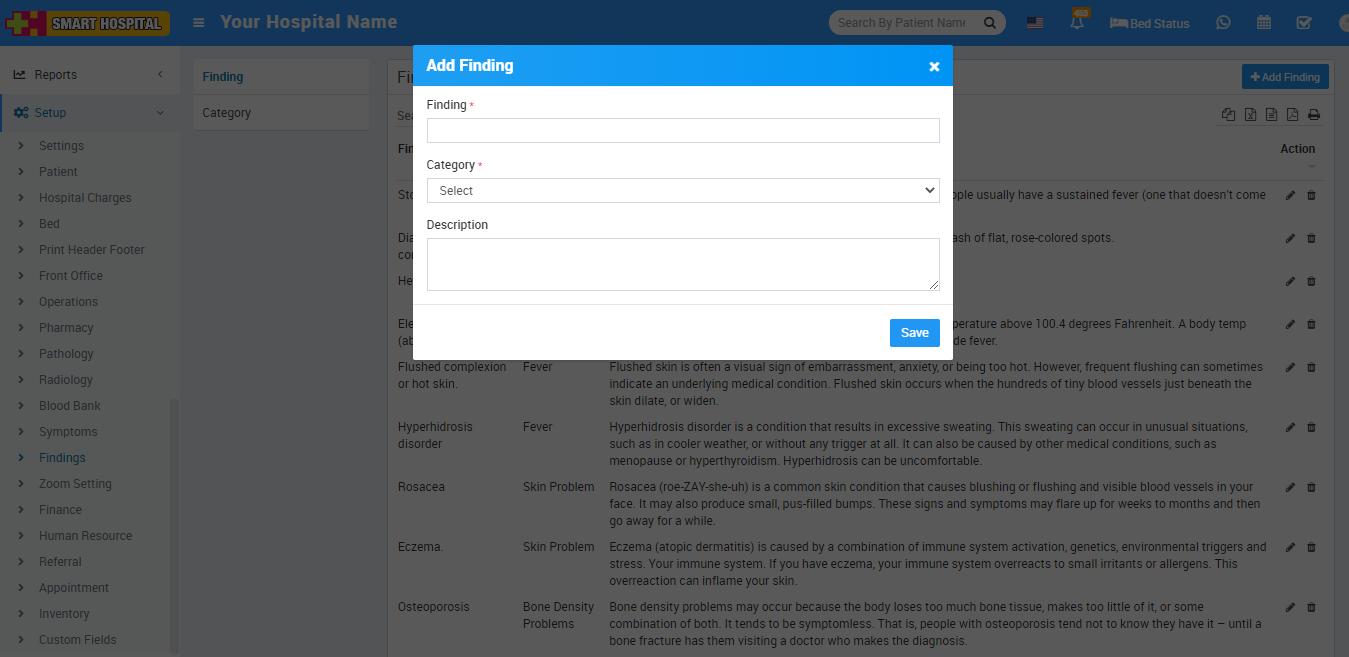 Now to add Findings click on Finding then click on + Add Finding button, here enter Finding (symptoms in patient), select Category, add Description and then click on Save button.