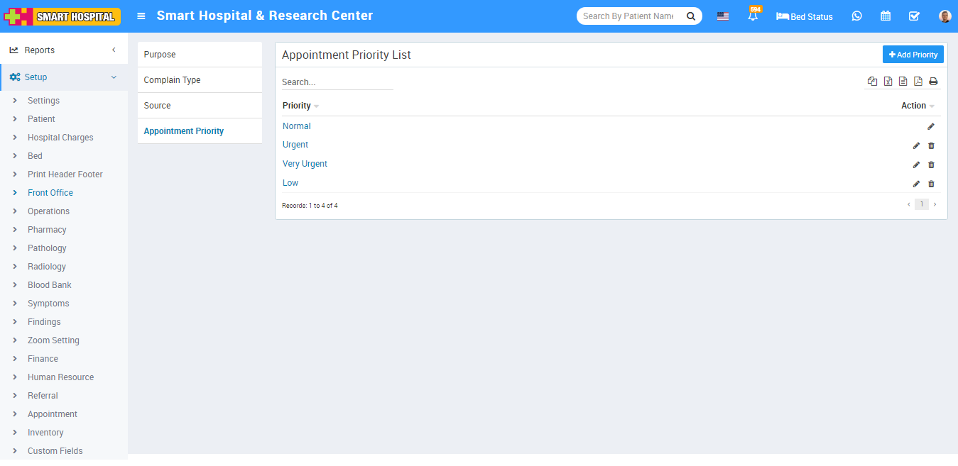 To edit Appointment Priority click on edit and to delete Appointment Priority click on delete icon present at Action column.