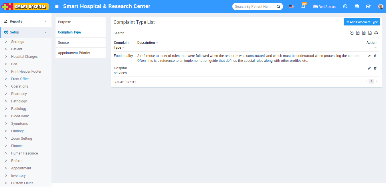 To edit Complain Type click on edit and to delete Complain Type click on delete icon present at Action column.