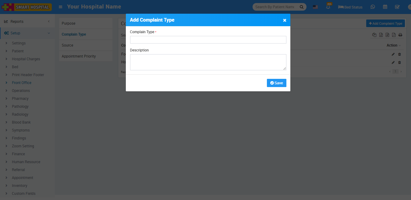 To add Complain Type click on + Add Complain Type button now enter Complain Type and Description and click on Save button.