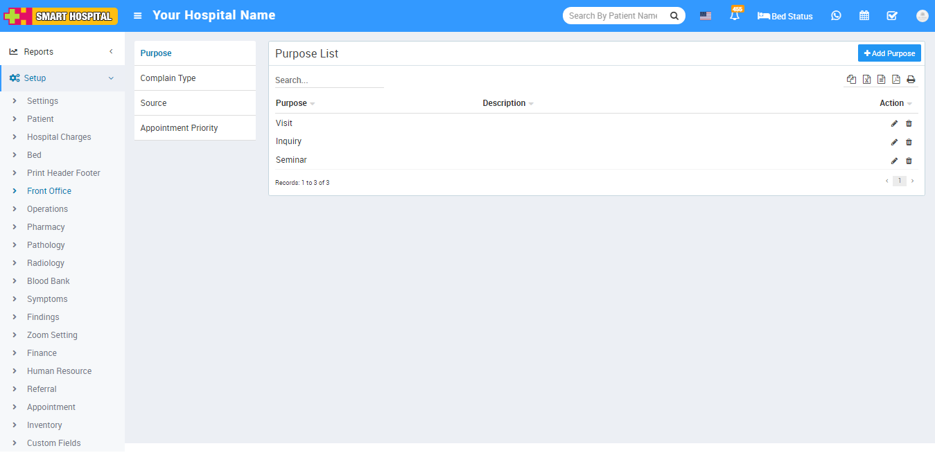 To edit Purpose click on edit and to delete Purpose click on delete icon present at Action column.