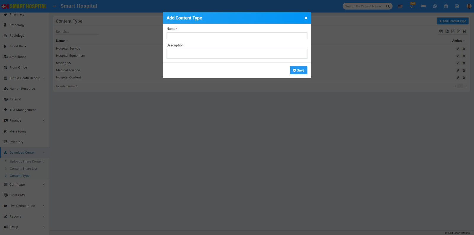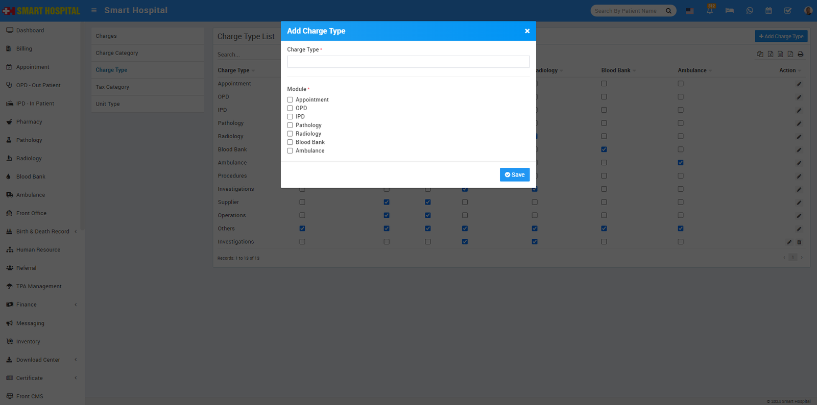 9. For adding Charges Type go to Setup > Hospital Charges > Charge Type, Here first we will add Charge Type, for this click on + Add Charge Type button. Now enter Charge Type. Here 5 default Charge Type are available.
