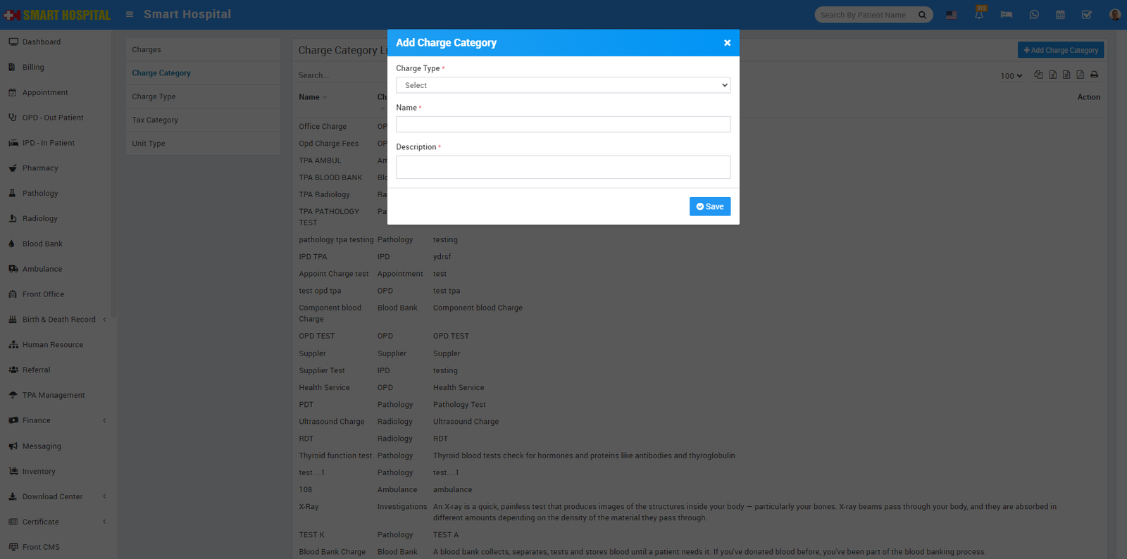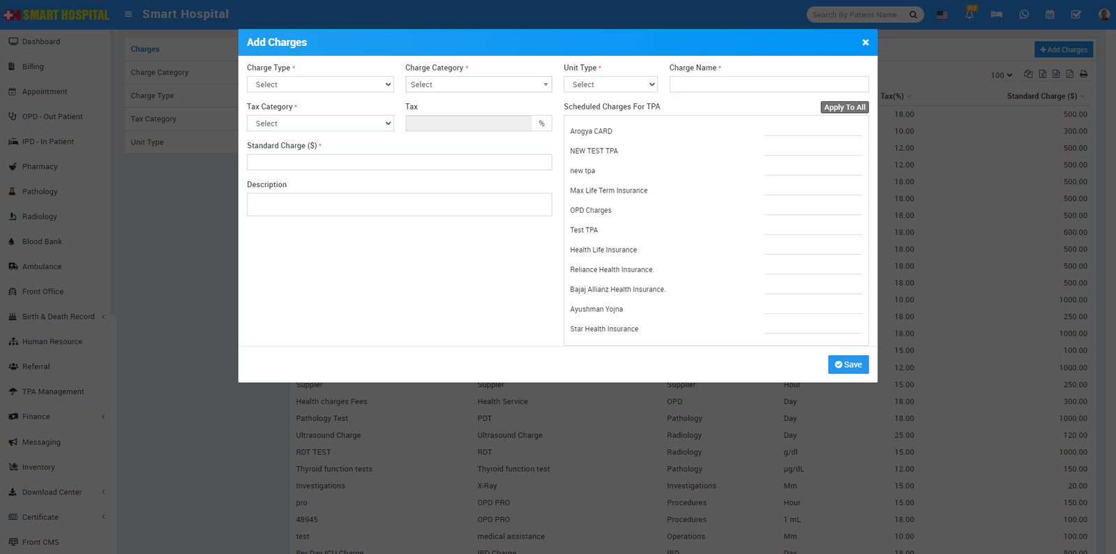 Now we will add Charges for this click on + Add Charge button. Now select Charge Type, Charge Category, enter Charge Code (it is like short code to differentiate two charges for same charge type and charge category), then enter Standard Charge, Description and if there is any TPA (Third Party Administrator or Insurance organization) is present then enter Scheduled Charge for this also).