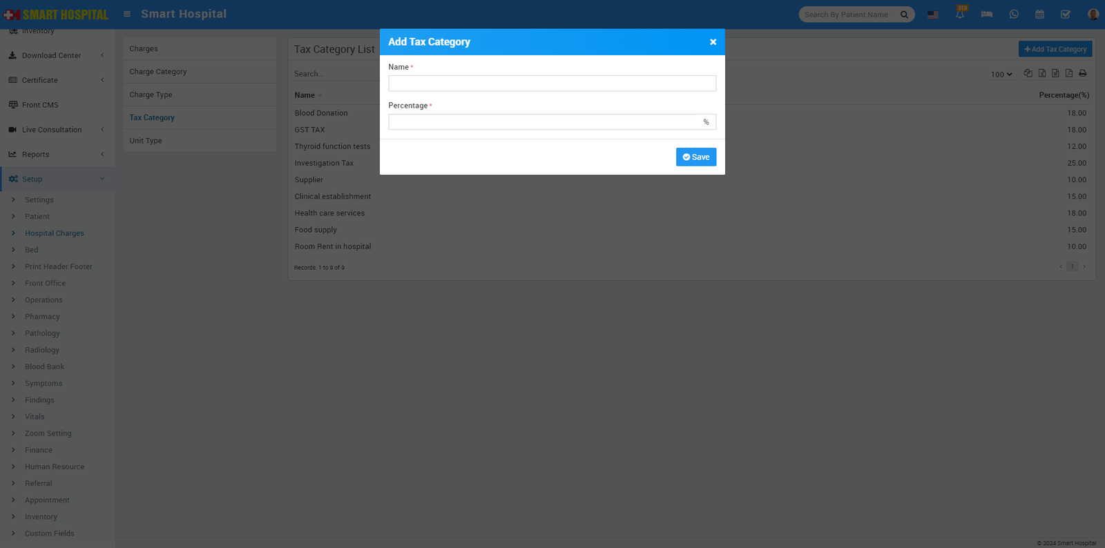 10. For adding Tax Category go to Setup > Hospital Charges > Tax Category, Here first we will add Charge Type, for this click on + Add Charge Type button. Now enter the Name and Percentage