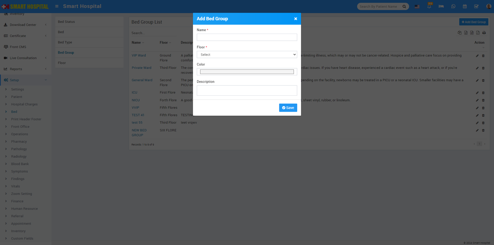 To add Bed Group click on + Add button then enter Bed Group Name, select Floor and also select the Color of the Bed for easy identification and enter Description.