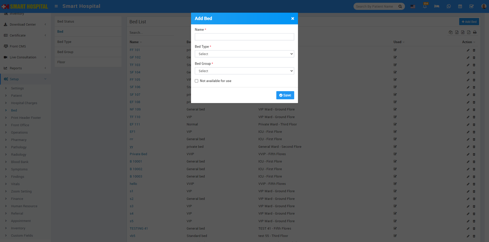 Now to add Bed click on + Add button then enter Bed Name, select Bed Type and Bed Group and if you want show as bed to not available just check the checkbox of Not available for use