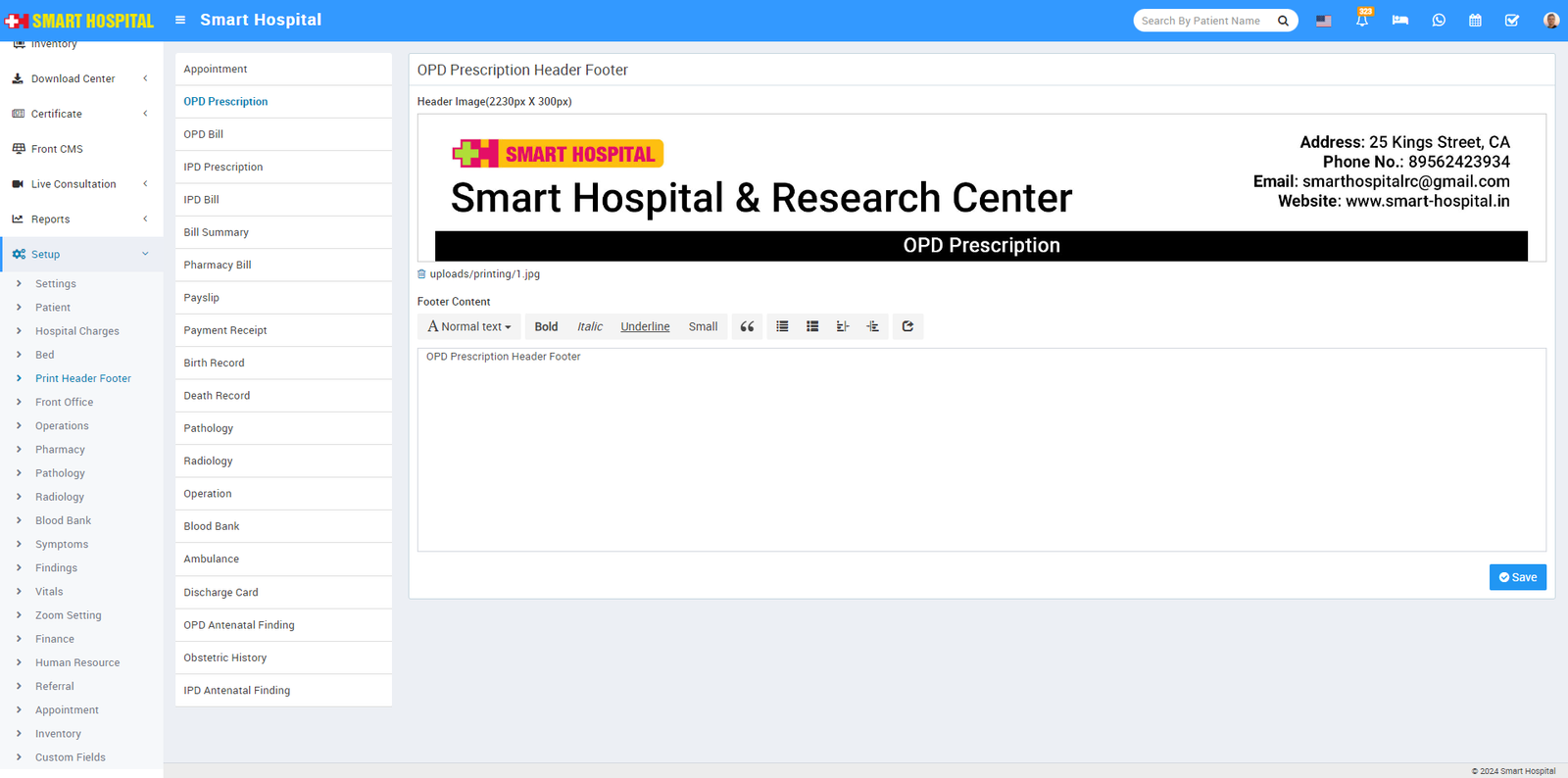 13. For adding header and footer in OPD prescription, IPD Bill, Pharmacy Bill, Payslip go to Setup > Print Header Footer.