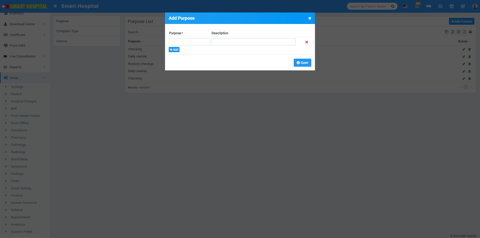 12. For adding Bed and their details go to Setup > Bed. Here first we will add Floors, Bed Groups, Bed Type. To add Floors click on + Add button then enter Floor Name and Description.
