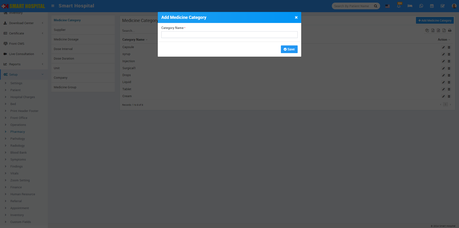 To add Medicine Category click on + Add Medicine Category now enter Medicine Category Name.