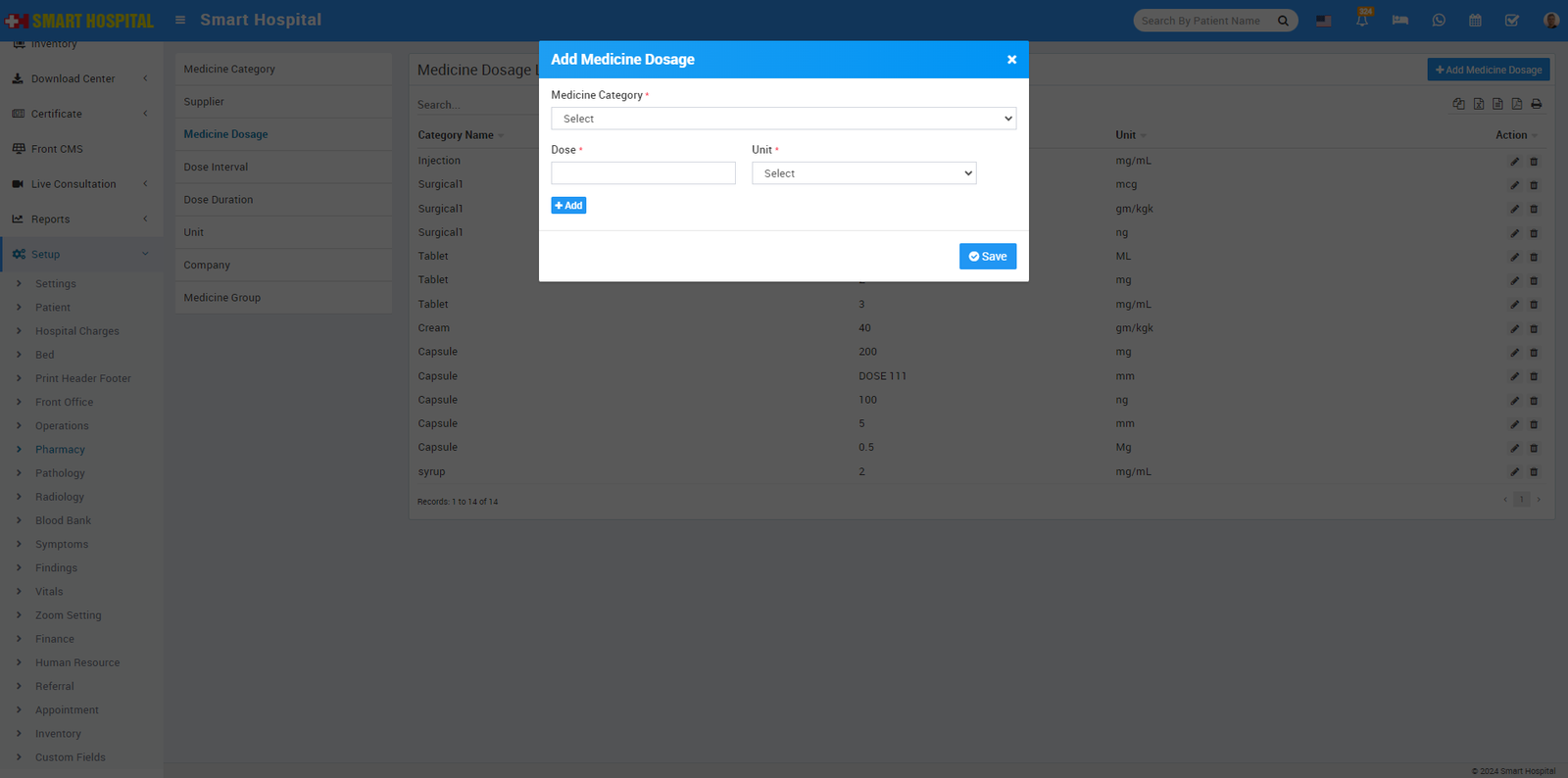To add Medicine Dosage click on + Add Medicine Dosage now enter Medicine Category, Dosage.