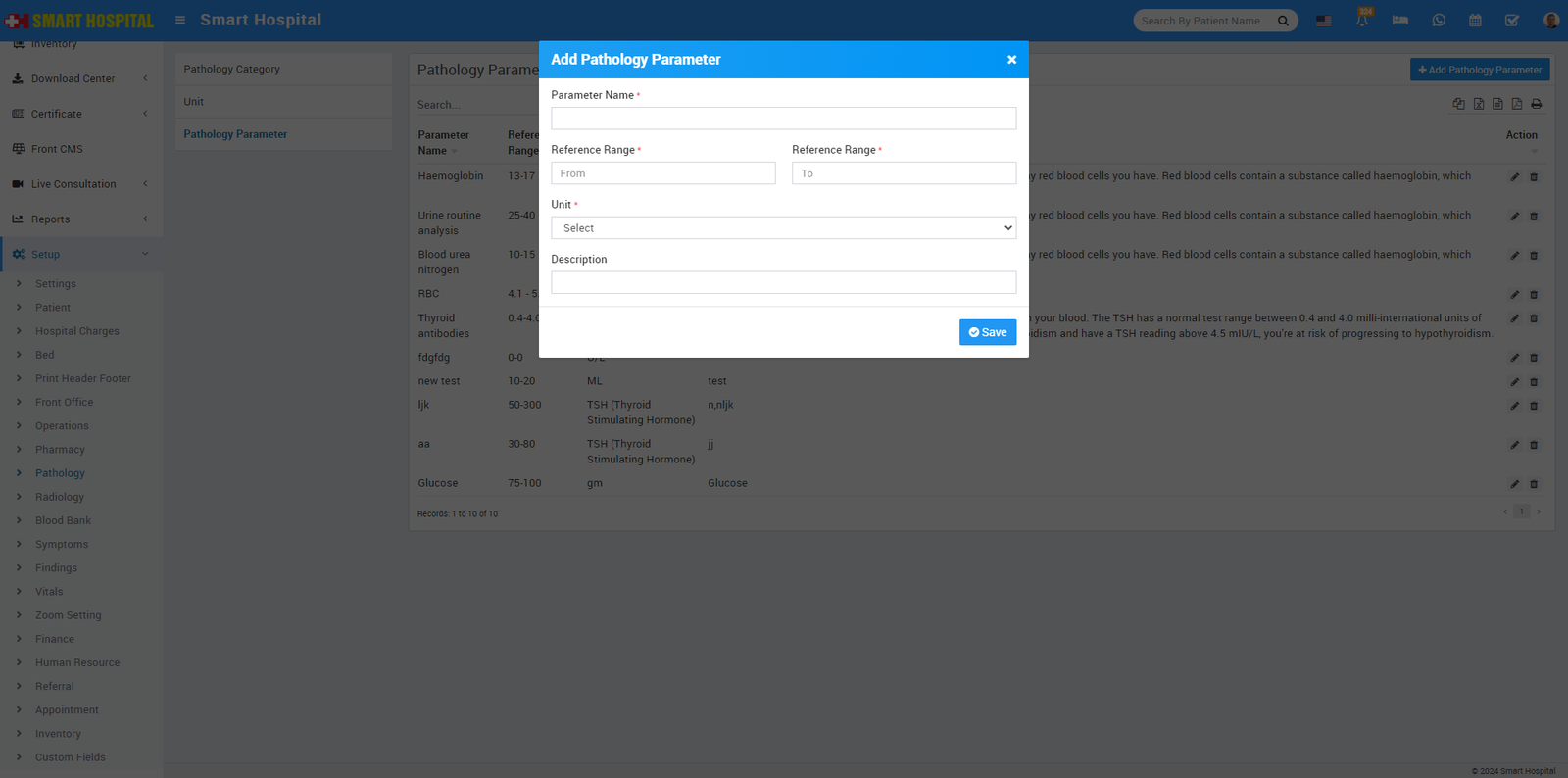 To add pathology parameter click on + Add Pathology Parameter button now enter Parameter Name, Reference Range From to To, Unit and Description and then click on the Save button.