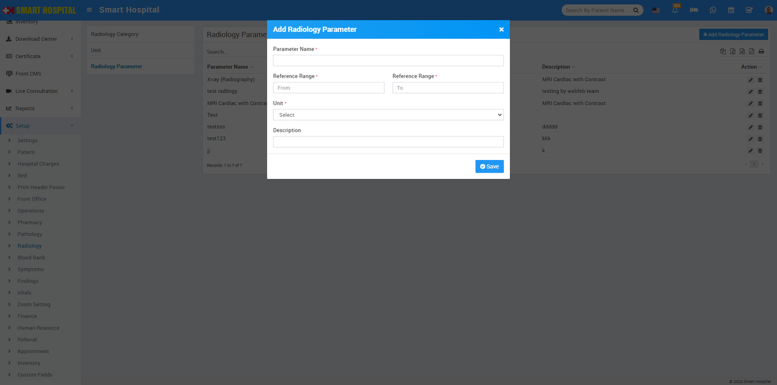 To add radiology parameter click on + Add Radiology Parameter button now enter Parameter Name, Reference Range From to To, Unit and Description and then click on the Save button.
