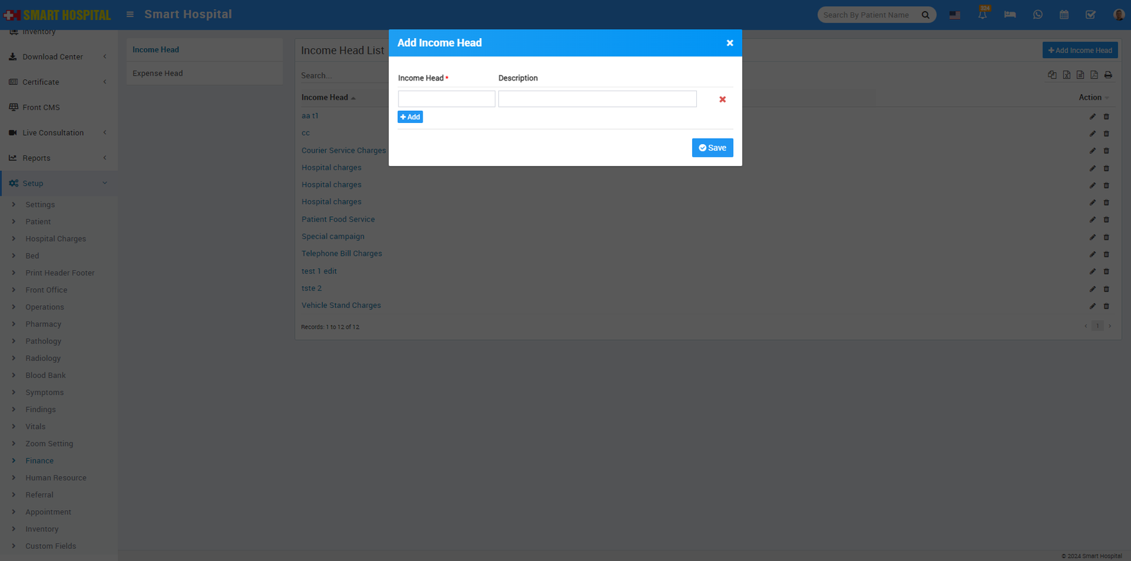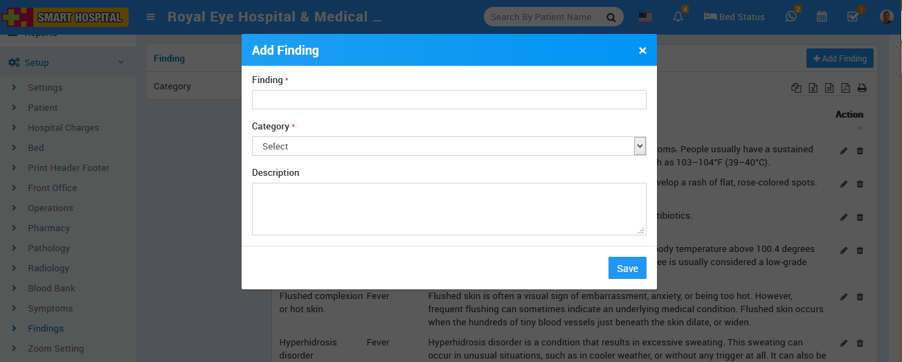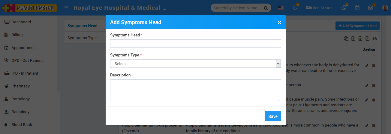 To add symptoms head click on + Add Symptoms Head then enter Symptoms Head, Symptoms Type and Description then click on the Save button.