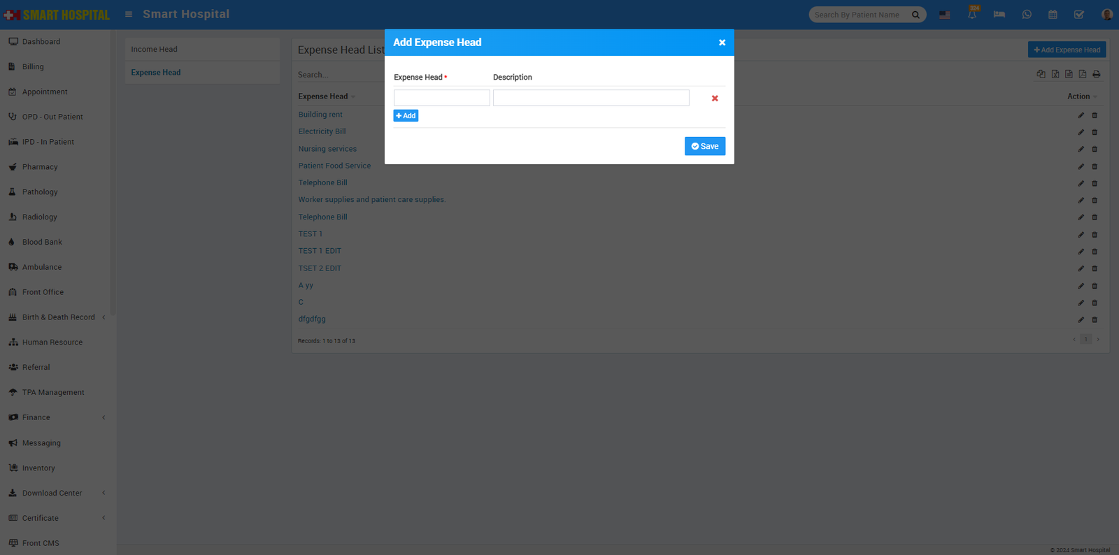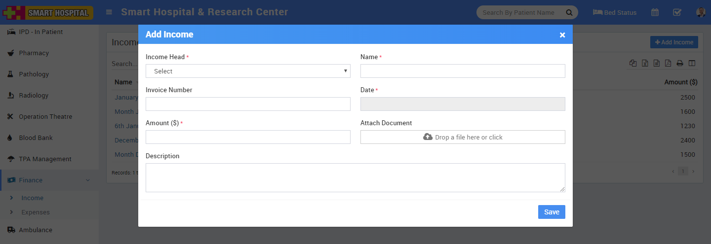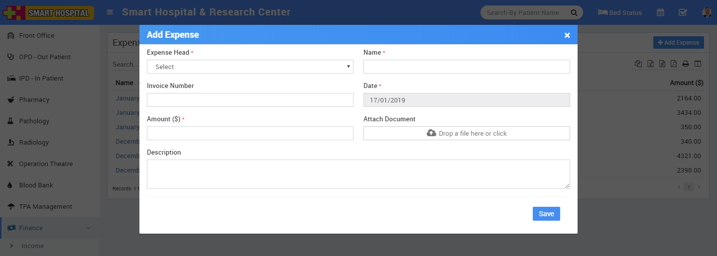 Expense - Here we will manage all expenses coming from different Expense Heads. To add new expense click on + Add Expense button here enter Expense Head, Name, Invoice Number, Date, Amount, Attach Document and Description.