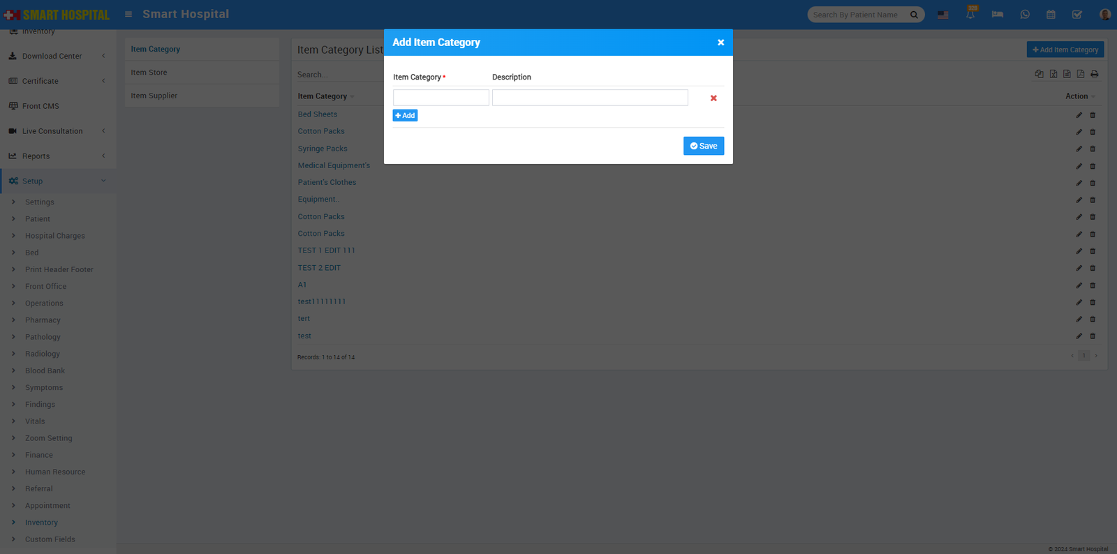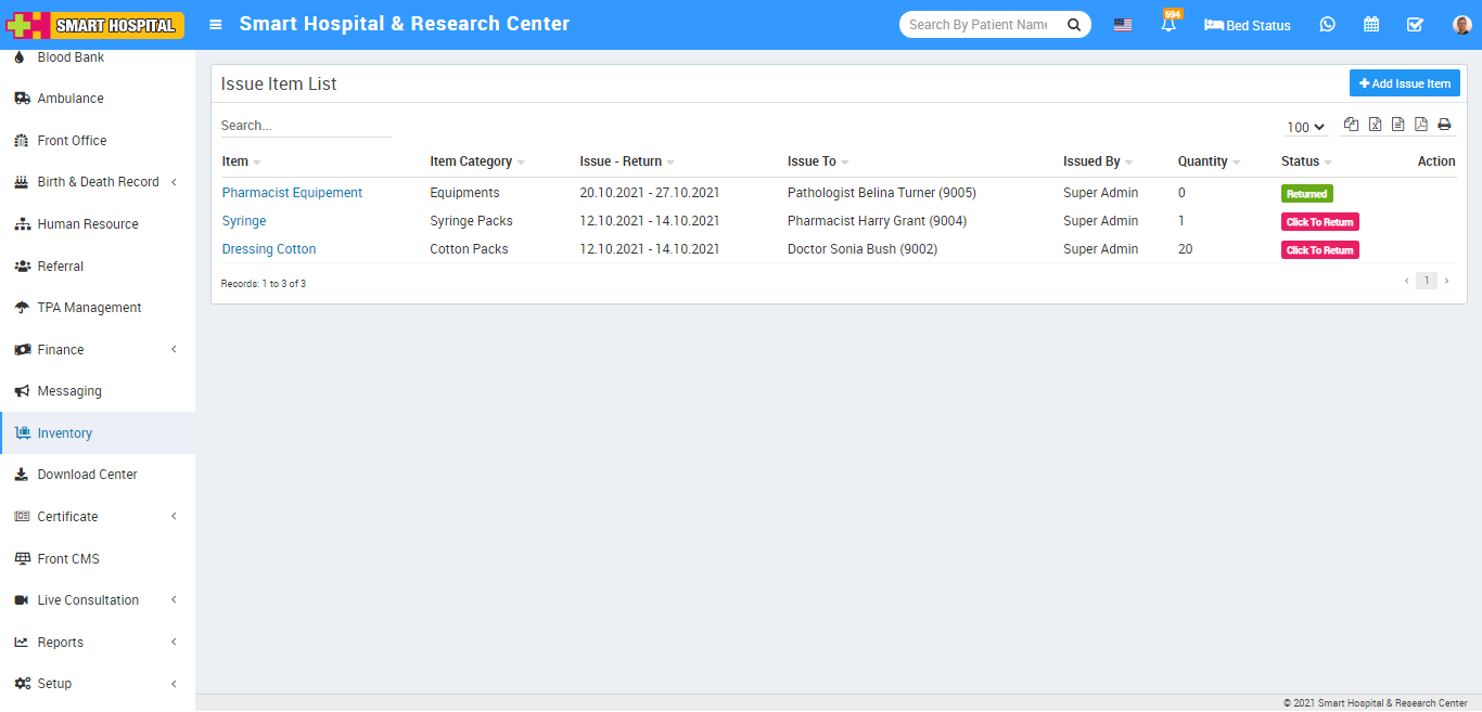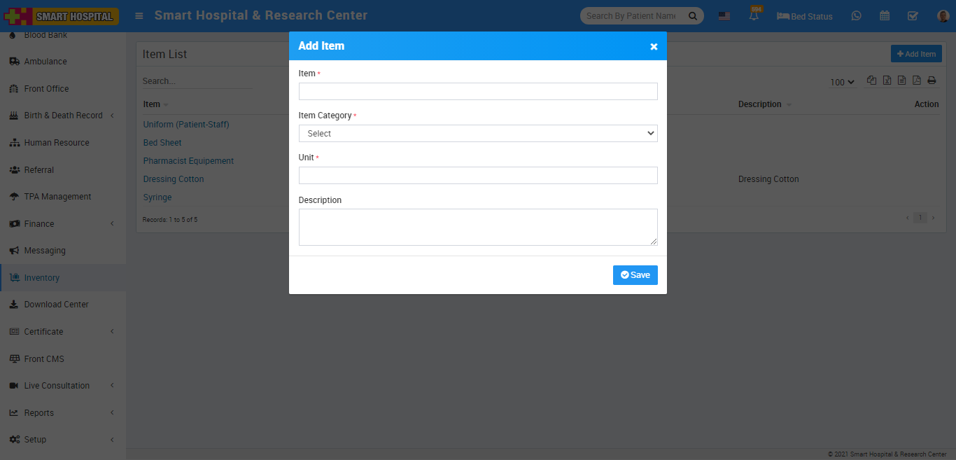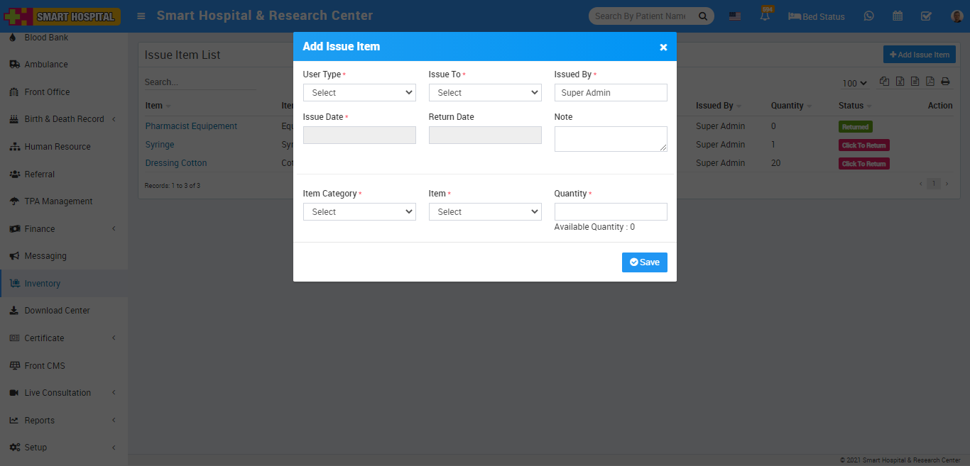 Inventory module is for managing different assets or items present in hospital. First we will add items then add item stocks then we will manage issue and return of items to different staff members.