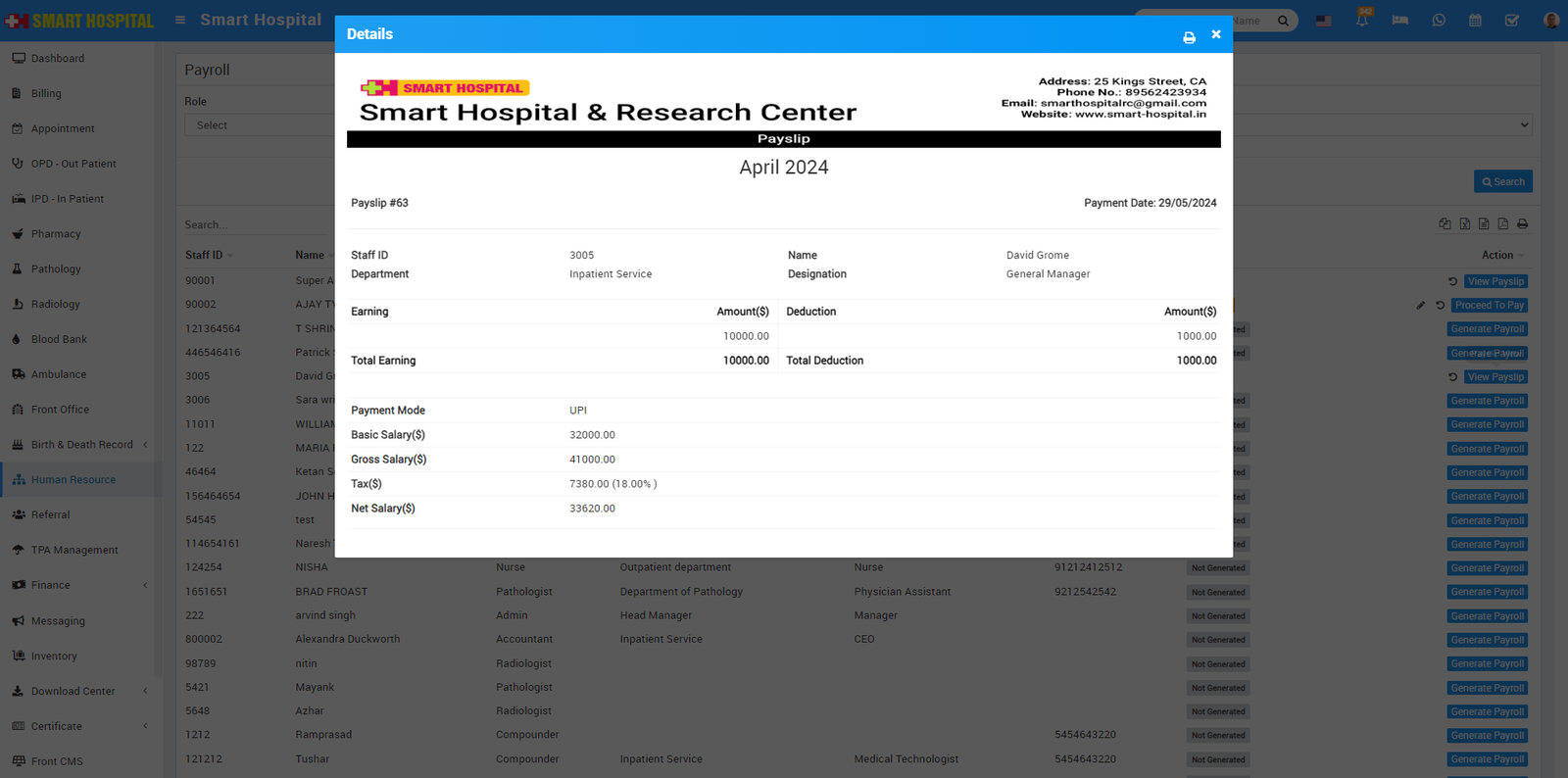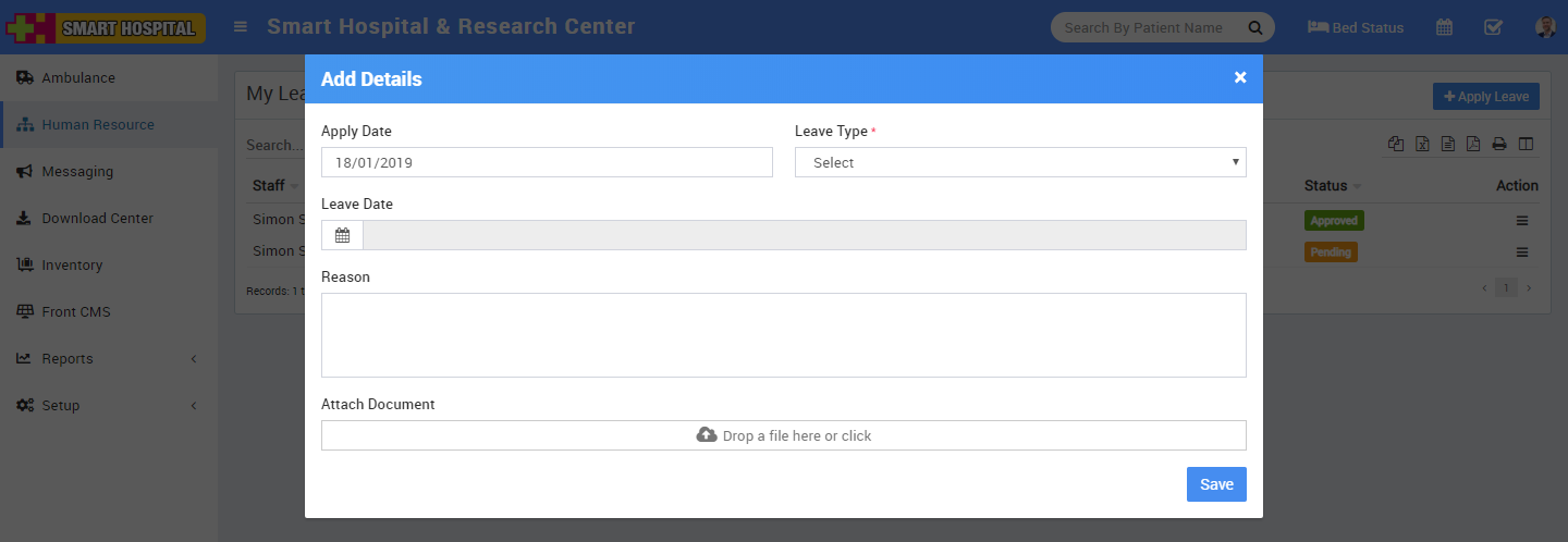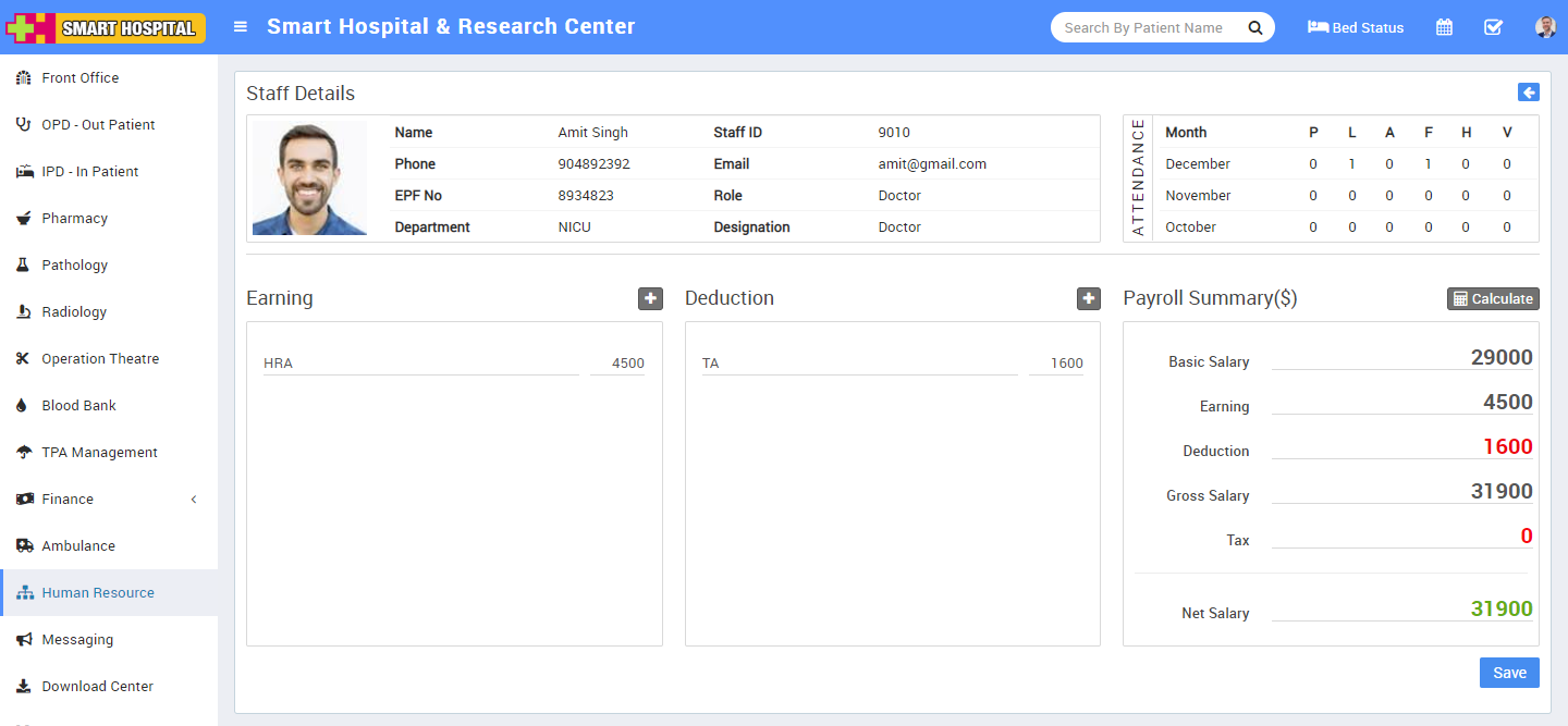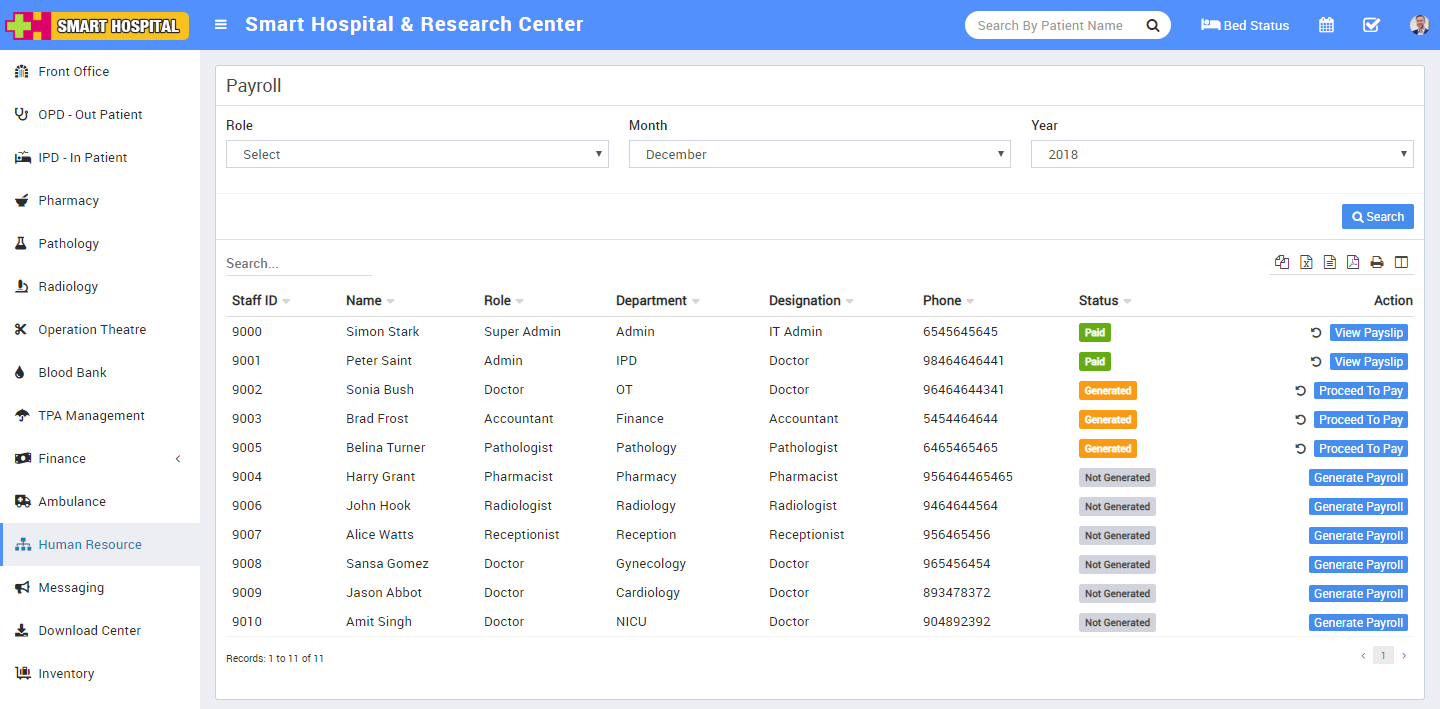 The main function of the Human resource module is to make necessary staff arrangements, maintain staff attendance for the hospital.