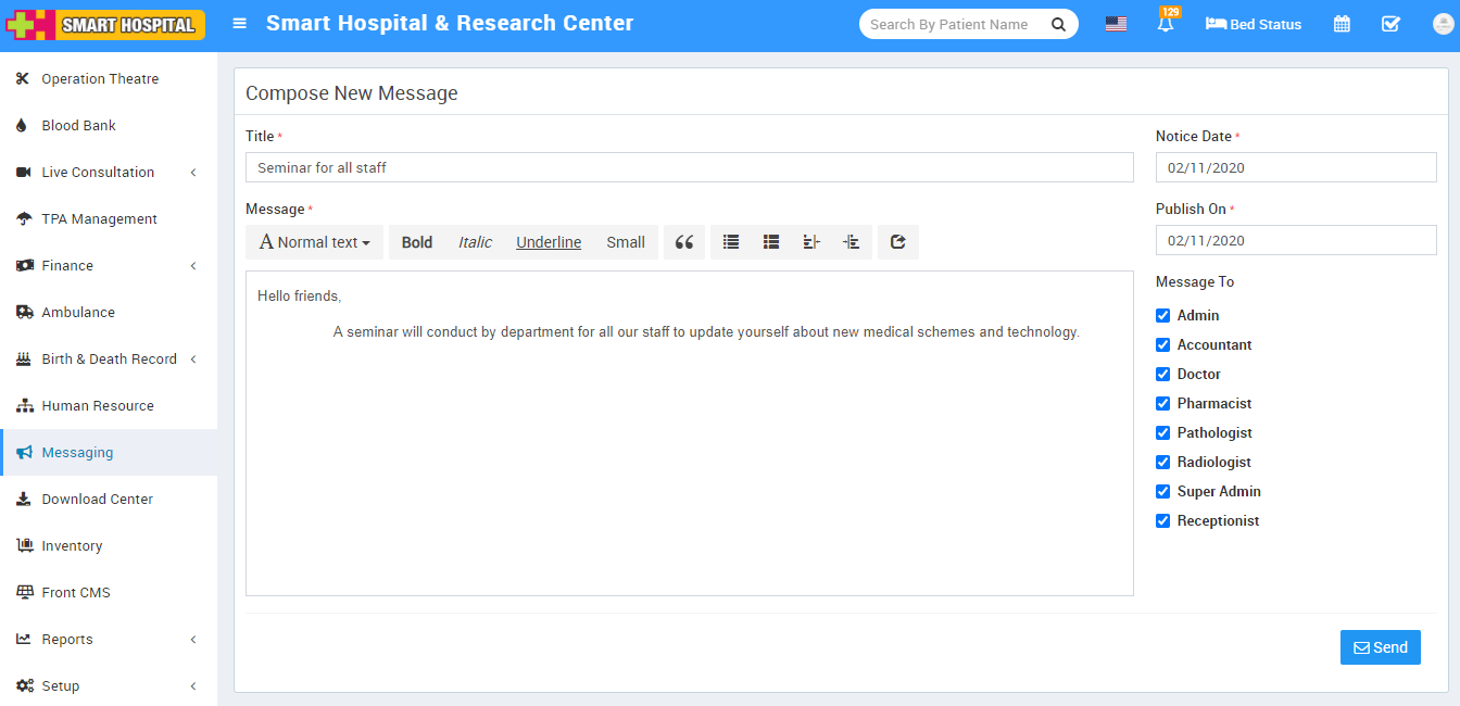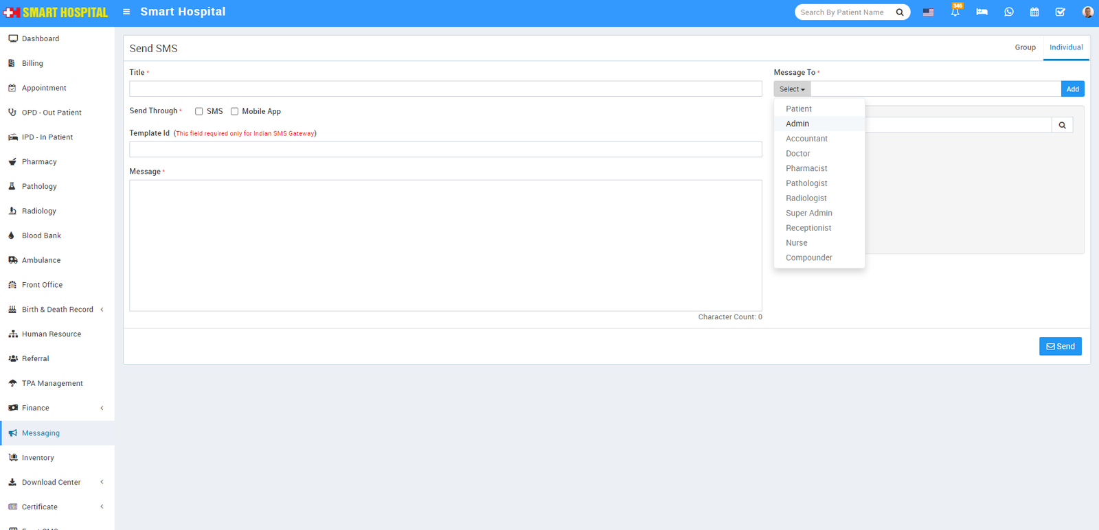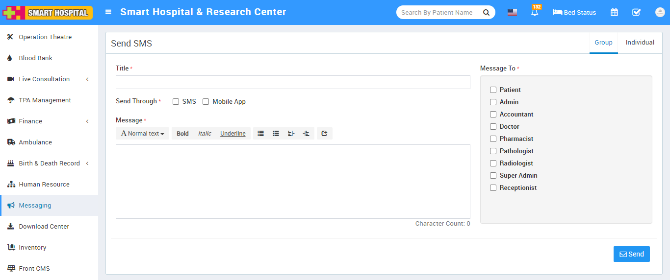 To send SMS click on Send SMS button. Here you can send two types of sms either group sms or individual user sms. To send group sms click on Group tab, here enter SMS Title, Send Through SMS or Mobile App, Message Text, Message To select different users group. Open Individual tab to send SMS to individually selected Patient, Admin and Accountant.