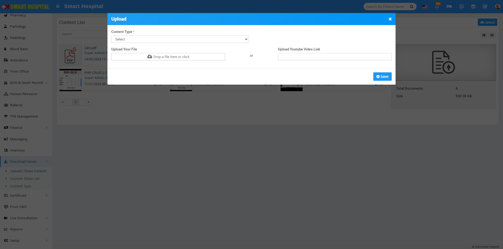 To upload document, go to the Upload/Share Content, here click on + Upload button, first select the Content Type and you can either Upload your File or Upload Youtube Video Link and click on Save.