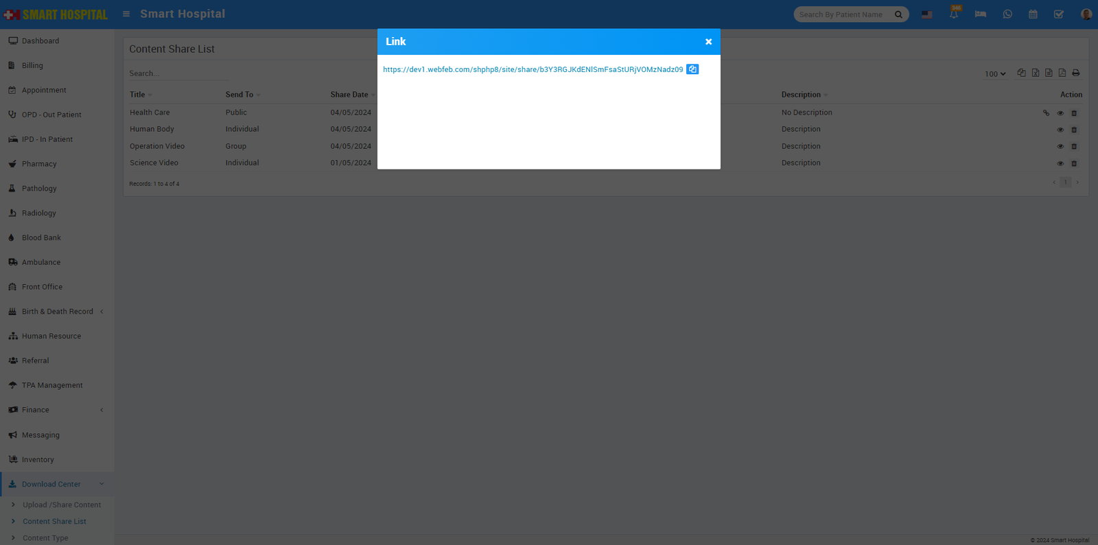 For Content Share List, go to the Download Center > Content Share List, In the page you can see all the contents details and its Link which you shared simply click on View icon details will be display