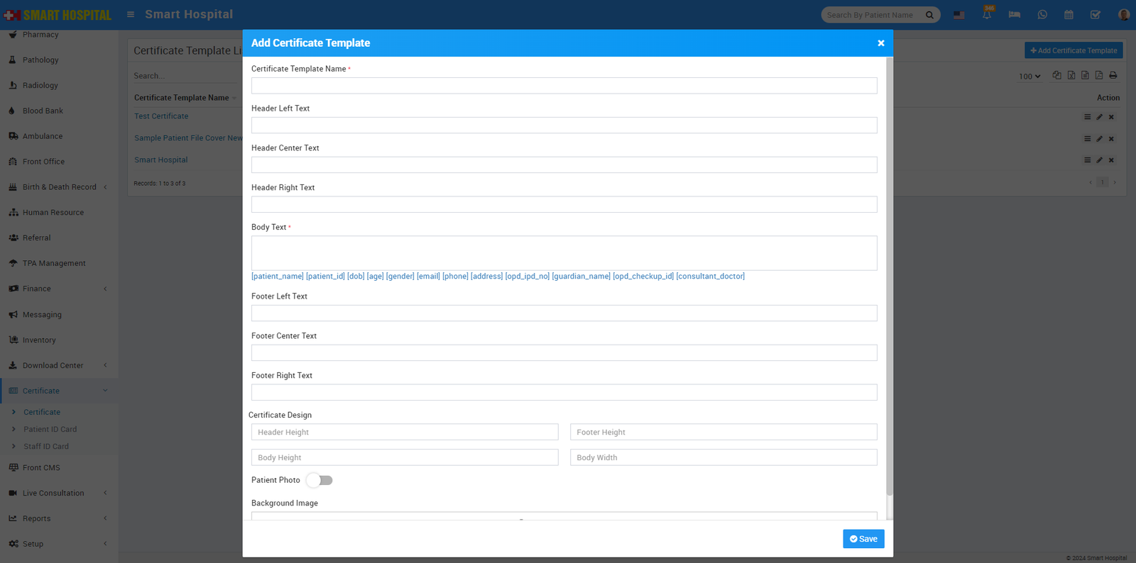 To add patient certificate, go to Certificate > Certificate > Certificate Template then click on the + Add Certificate Template button, present at the top right corner of the page and then enter Certificate Name (certificate name is only for certificate design reference purpose it will not be print on actual certificate), Header Left Text, Header Center text, Header Right Text, Body Text (enter specified keywords for replacing student data dynamically at time of certificate generation), Footer Left Text, Footer Center Text, Footer Right Text, Certificate Design – Header Height, Footer Height, Body Height, Body Width, Patient Photo, Background Image and then click on Save button. You can view this added record in the Certificate List page.