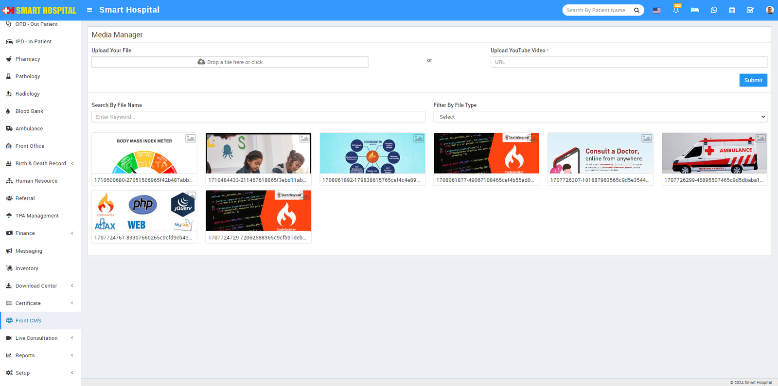 To upload file (like images) and YouTube videos , go to Front CMS > Media Manager then Choose or drag file in the Upload Your File option so selected file will be upload in your Smart hospital on Media Manager. Also to upload youtube video enter youtube url at Upload Youtube Video URL section and then click on Submit button. Uploaded file and youtube video will show at Media Manager list page.
