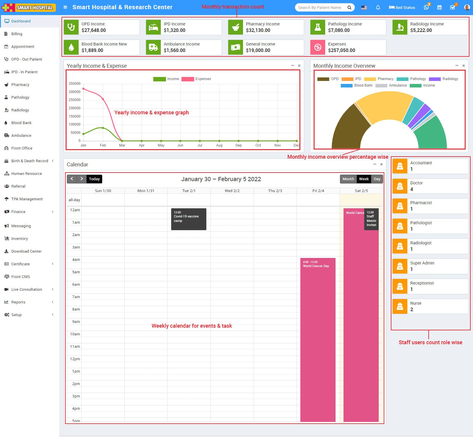 Apart from above we also like to provide access to our Smart Hospital to different users like Doctors, Accountants, Pharmacist, Radiologist, Pathologist, and Patient. For these Smart Hospital have 9 inbuilt user's roles - Super Admin, Admin, Doctor, Accountant, Pathologist, Radiologist, Nurse, Receptionist and Patient. Virtually you can create unlimited number of user roles for staff members.