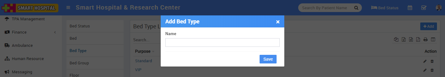 To to add Bed Type click on + Add button then enter Bed Type Name.