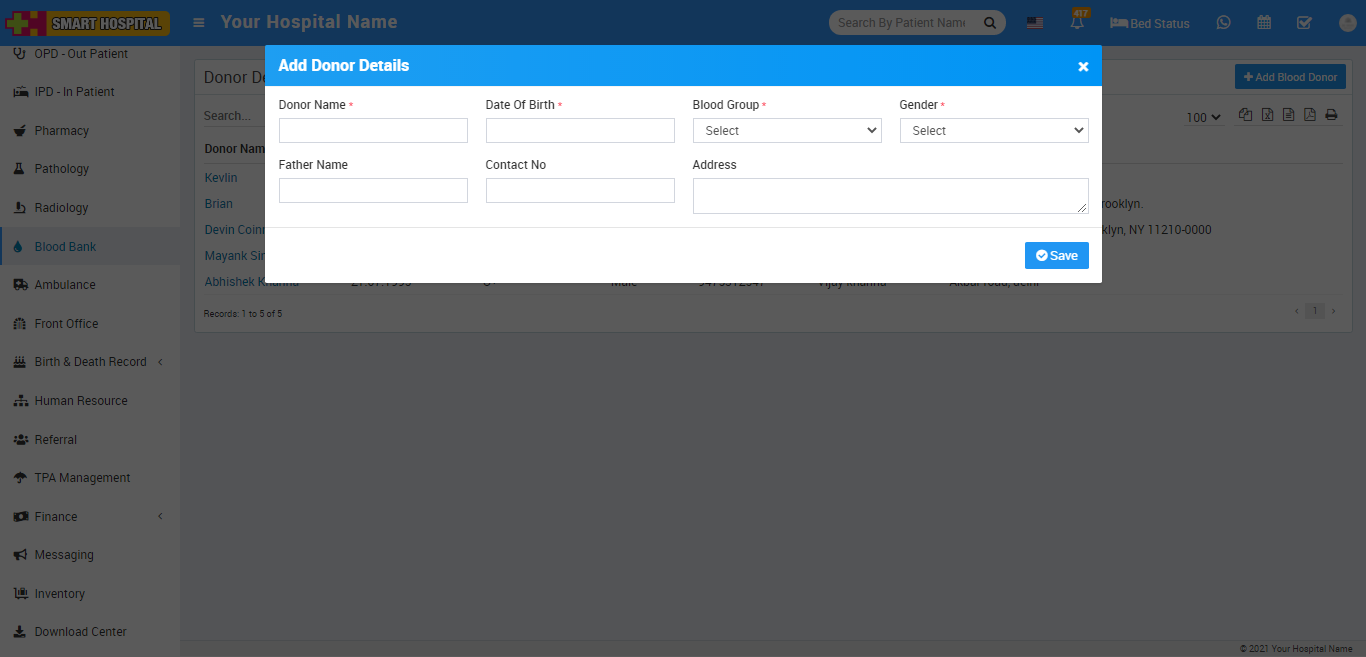 9. Blood Bank - for managing blood group available blood stock, donor details and blood issue details