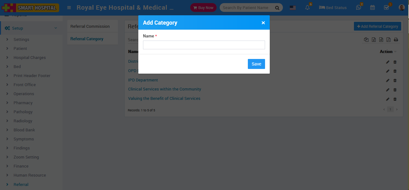 To add referral category click on + Add Referral Category then enter Name and then click on the Save button.