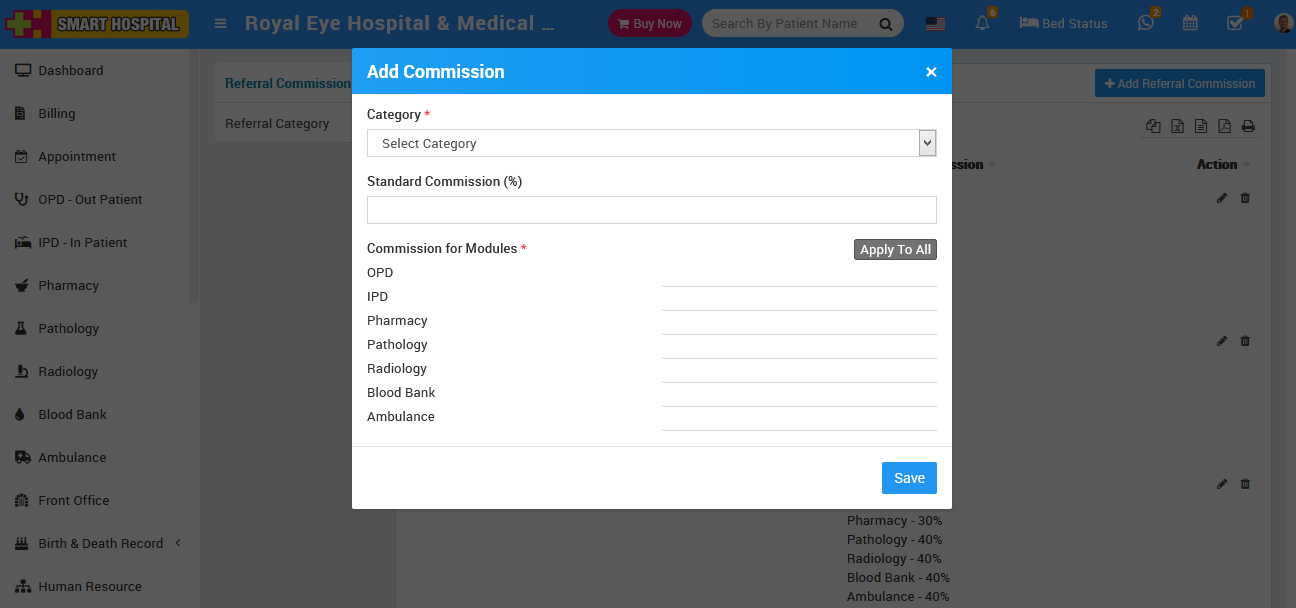 To add Referral Payment go to Referral module then click on +Add Referral Payment button. Here add Patient, Patient Type, Bill No/Case Id, Patient Bill Amount, Payee, Commission Percentage (%), Commission Amount and then click on Save button.