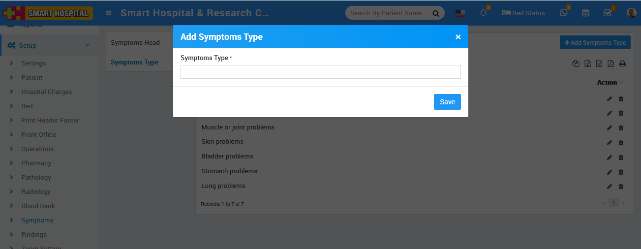 To add symptoms type click on + Add Symptoms Type then enter Symptoms Type and then click on the Save button.