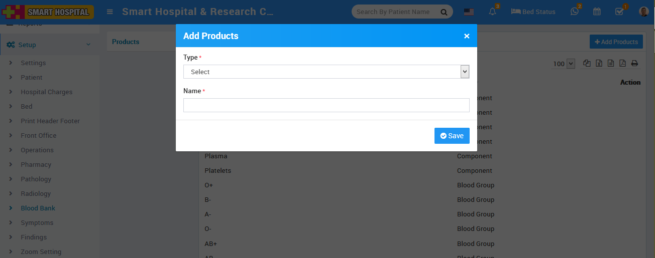 19. To add blood bank product, go to Setup > Blood Bank then click on + Add Product and then select Type and and enter product Name and then click on Save button.