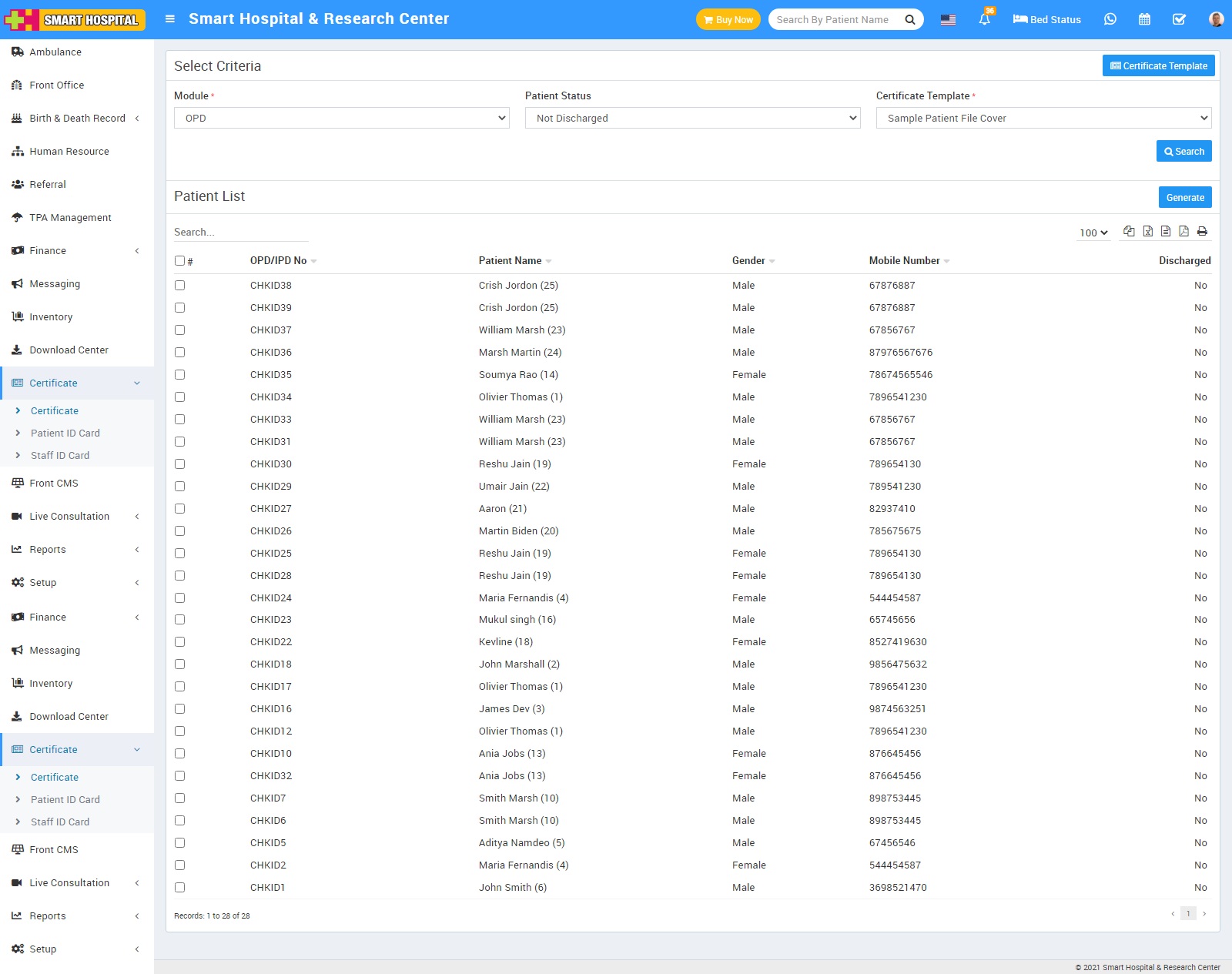 To generate certificate, go to Certificate > Generate Certificate then select Module, Patient Status and Certificate and then click on Search button. The list of patient will be shown in the below of the page.