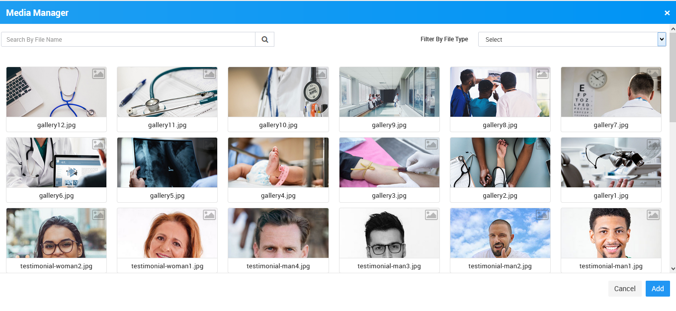 To add banner image, go to Front CMS > Banner then click on Add Image button present at top right corner in the Banner Images page, at click of this button Media Manager modal will be open, here select the file which you want to add in banner image ( you can search any file by its file type ( image, Video, Text, Zip, Pdf etc.) ) then click on Add button.