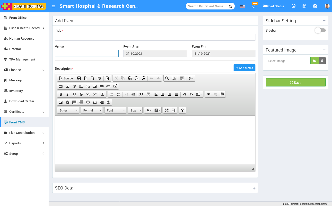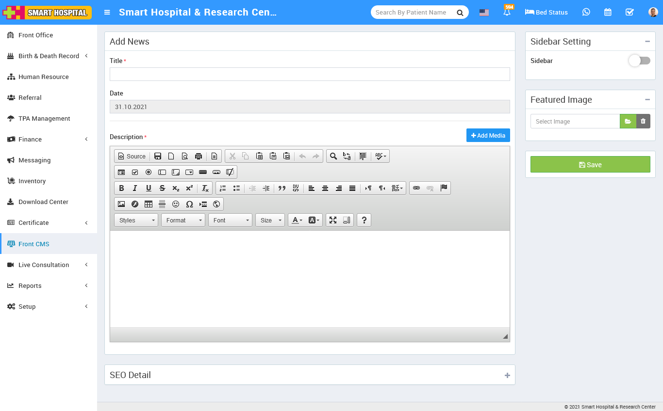 To add new news go to Front CMS then click Down Arrow icon and then click on Add News button. Here you can add all News/Notices of your hospital. To add new news click on + Add button. Here enter news Title, News Date, Description, SEO Detail Meta Title, Meta Keyword, Meta Description then select Sidebar Setting, Featured Image then click on Save button.