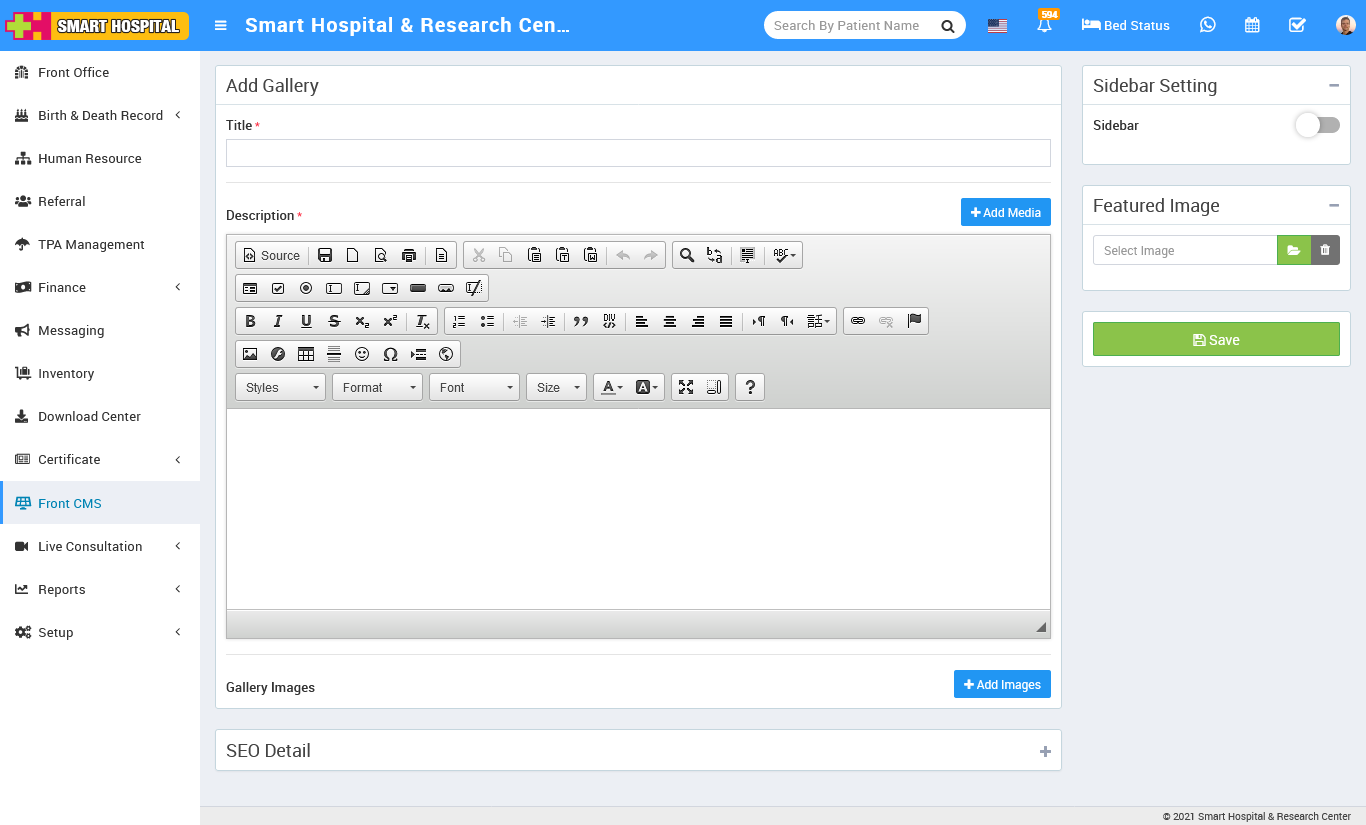 To add new gallery go to Front CMS then click Down Arrow icon and then click on Add Gallery button. Here you can add all image/video galleries of your hospital. To add new gallery click on + Add button. Here enter gallery Title, Description, Gallery Images, SEO Detail Meta Title, Meta Keyword, Meta Description then select Sidebar Setting, Featured Image then click on Save button.