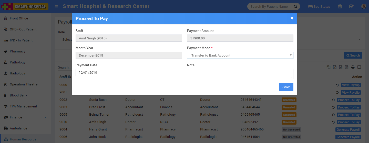 Now come again on payroll page and check this staff payroll status for same month now it should be Generated and in Action column Proceed To Pay button should be visible. Here click on Proceed To Pay button to pay generated salary to this staff. Now at Proceed To Pay modal popup window you can Staff, Net Payment Amount, Month-Year, select Payment mode through which you are paying salary, Payment Date, and Note then click on Save button.