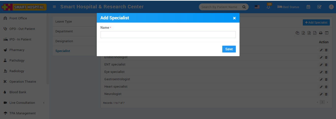 To add Specialist click on + Add Specialist button now enter Specialist Name.