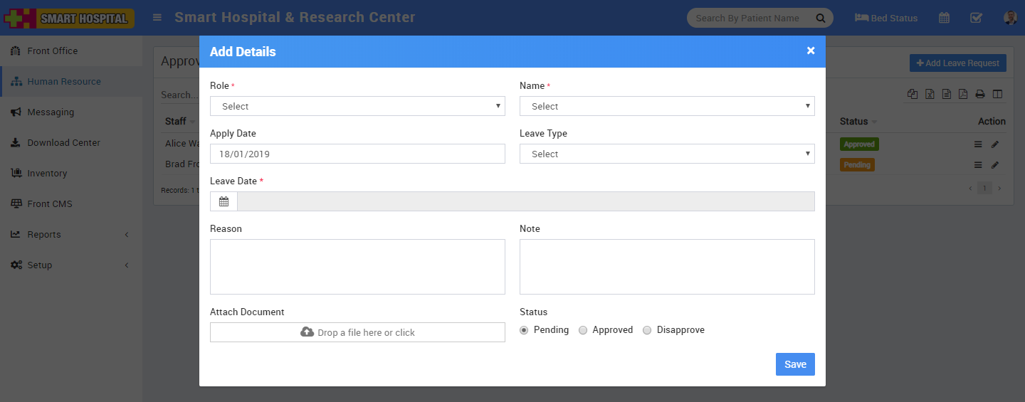 In this section you can apply for leave request or if you have permissions then you can approve other leave request. For approve leave request click on Approve Leave Request button here you can view, approve or manually submit staff leave request. Click on View icon button from Action column to see details of applied leave request. Now at this modal popup window you can see details of leave request and change its status to Approve/Disapprove/Pending then enter any Note then click on Save button.