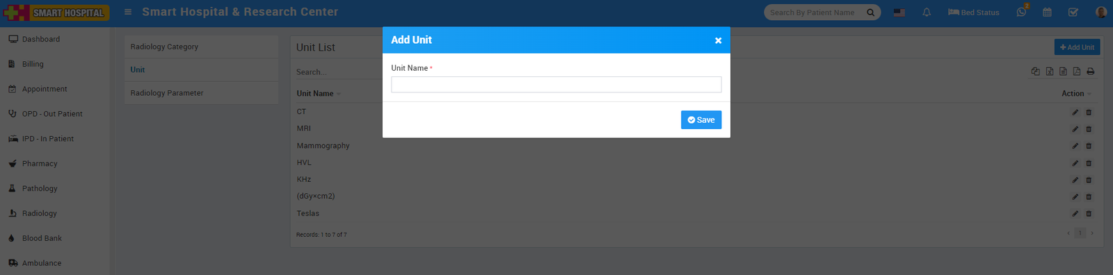 To add radiology unit click on + Add Unit button now enter Unit Name.
