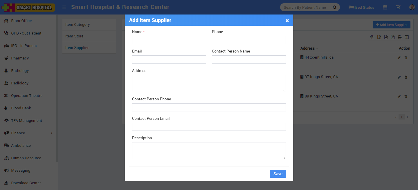 To add Item Supplier click on + Add Item Supplier button now enter Item Supplier Name, Phone, Email, Contact Person Name, Address, Contact Person Phone, Contact Person Email and Description.