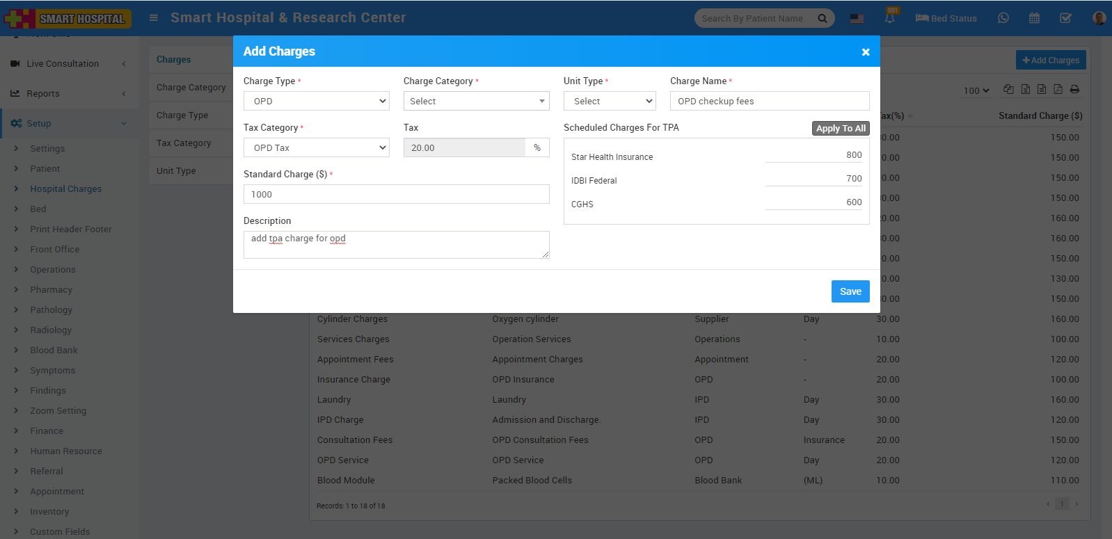 To add TPA charges on hospital charges, go to Setup > Hospital Charges, this will redirect you in Charges Details List page, here click on +Add Charges button present at the top right corner of the page, then enter all mandatory details like Charge Type, Charge Category, Unit Type, Charge Name, Tax Category, Tax Category and Scheduled Charges For TPA (enter amount for different TPA) and then finally click on the Save button.