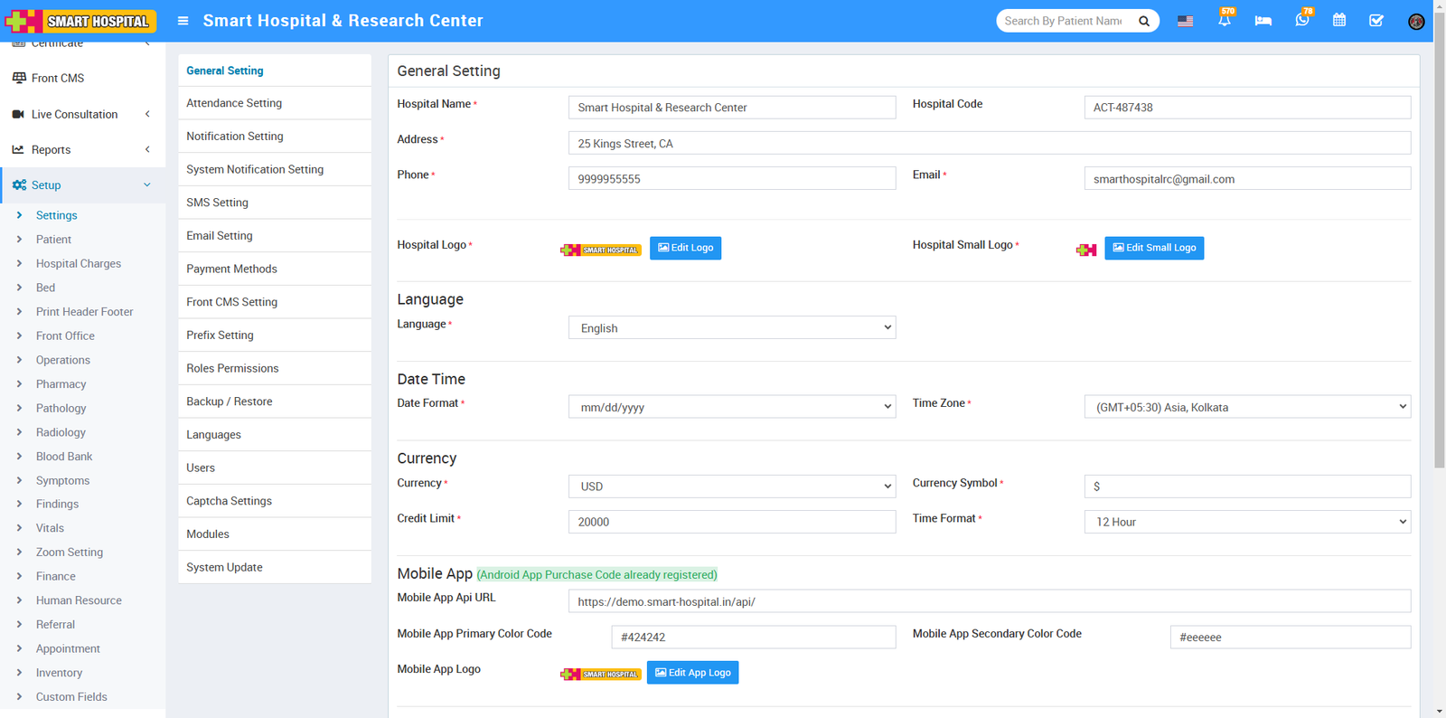 Apart from logos here you can update your Hospital Name, Hospital Code (Is your affiliation and accreditation no), Address, Phone, Email, Language (your preferred country language in which you want to run your Smart Hospital), Date Time – Date Format, Timezone, Currency – Currency (ISO Standard 3 digit code), Currency Symbol, Credit Limit (used for IPD module balance amount credit limit), Time Format (12 hours or 24 hours). Mobile App – Mobile App API URL, Mobile App Primary Color Code, Mobile App Secondary Color Code, Mobile App Logo. Miscellaneous – Doctor Restriction Mode (Disable/ Enable), Superadmin visibility, Patient Panel, Scan Type (QR Code & Barcode) and Current Theme click on Save button to update these details.