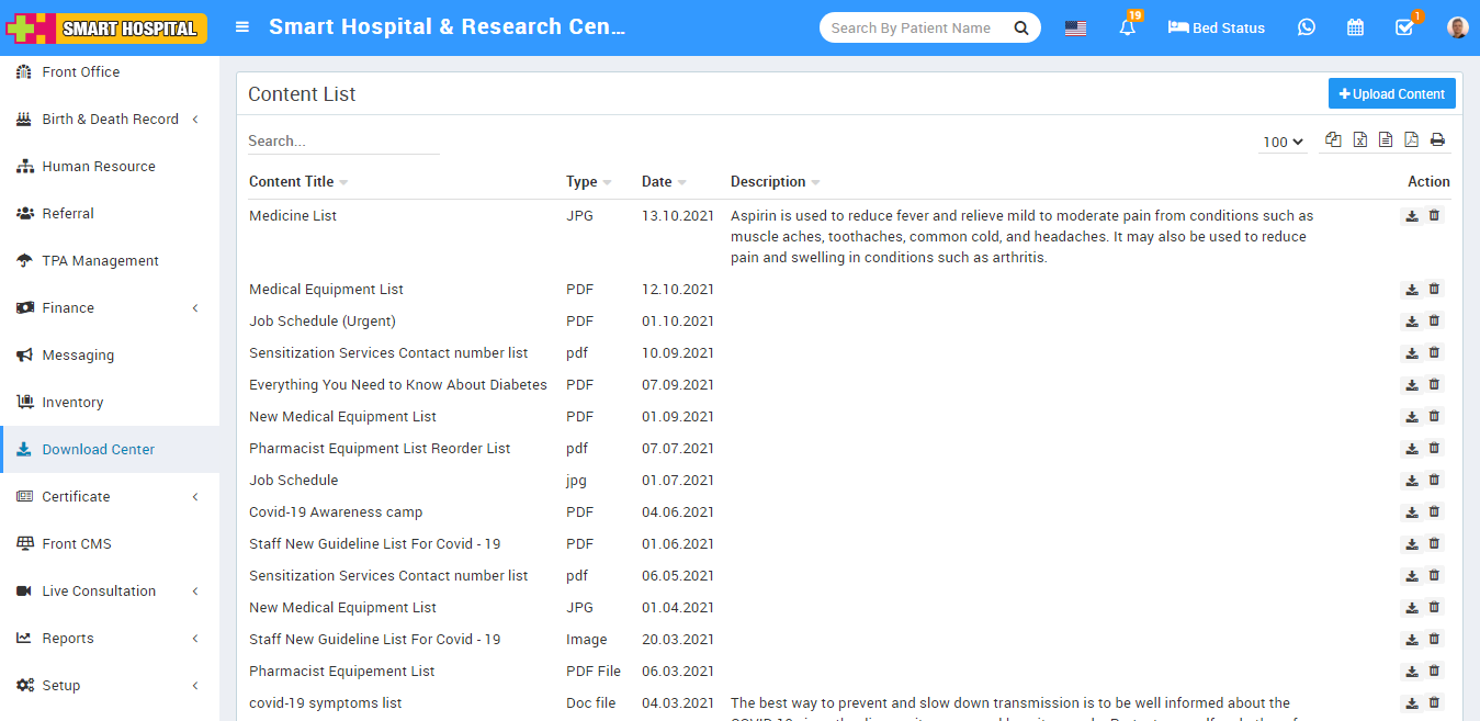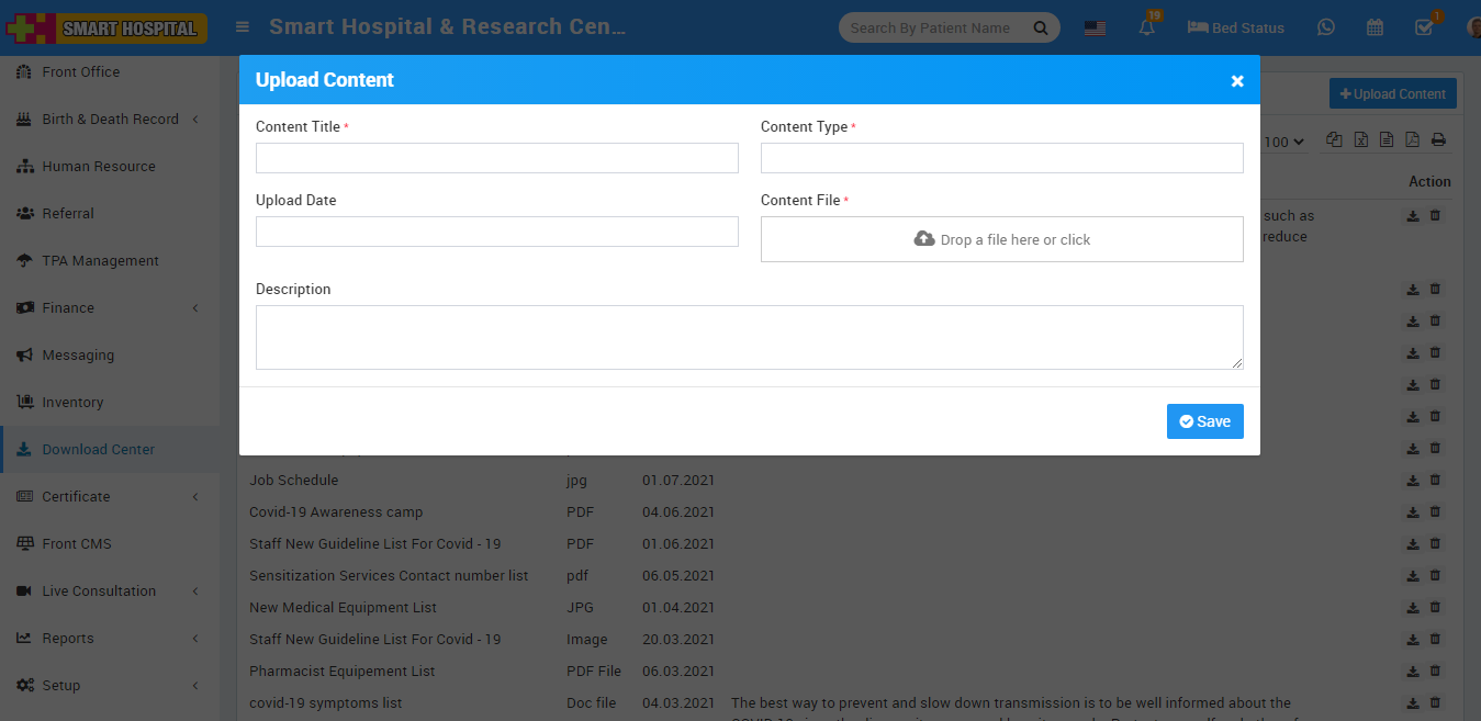 To upload document click on + Upload Content button here enter Content Title, Content Type, Upload Date, Content File and Description.