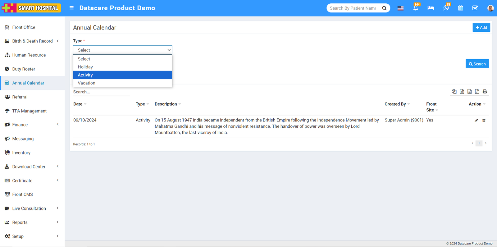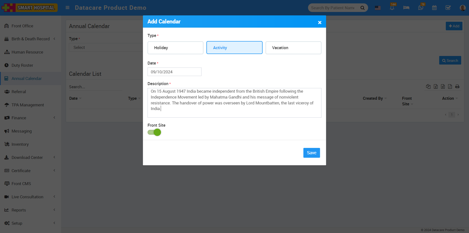 Now go to the Add button, showing at the top right corner and click on it, Add window will be open In this window, you can see options for Type: Holiday, Activity, and Vacation. Simply select 'Activity' by clicking on it, then choose the date when the activity will occur. Add a description of the activity , and if you want to display this activity with details on the front site of your Smart Hospital, enable the 'Front Site' button.