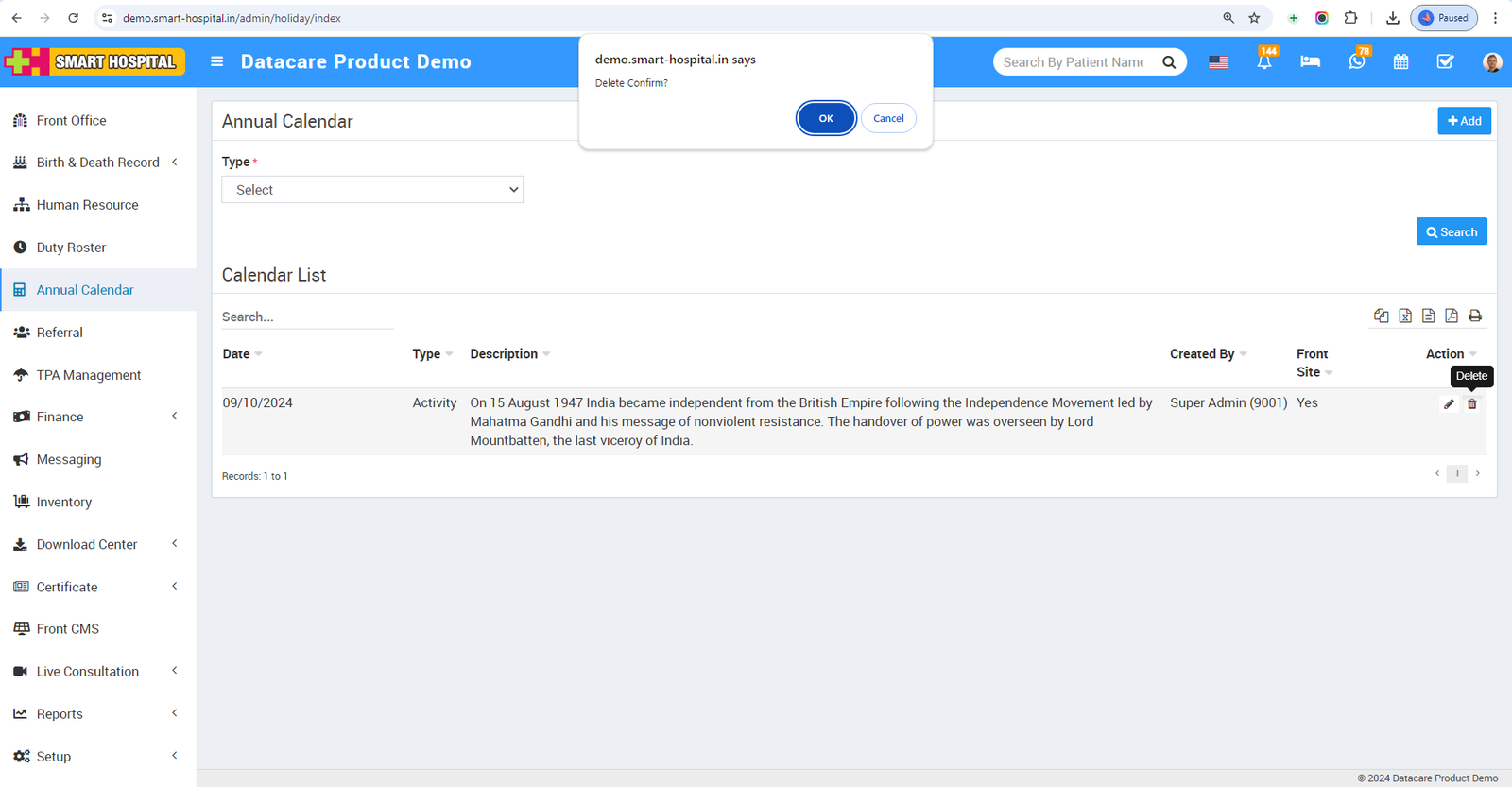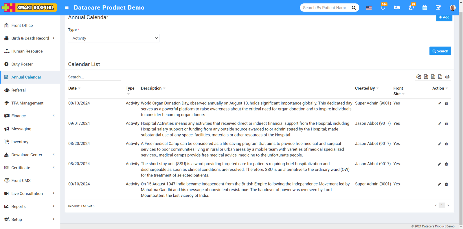 To add an activity to the annual calendar, go to the Annual Calendar module in your Smart Hospital system and click on it. The Annual Calendar page will open on the right side.