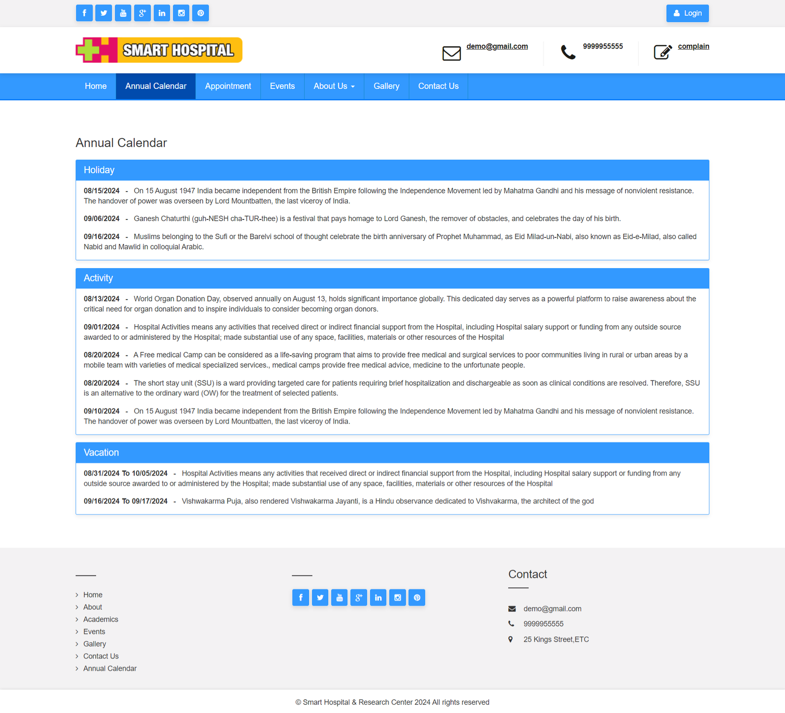 Additionally you can also see the activity details on the front site of your Smart Hospital, as you enabled this option when adding the activity. Simply go to the front site of your Smart Hospital and go to the annual calendar