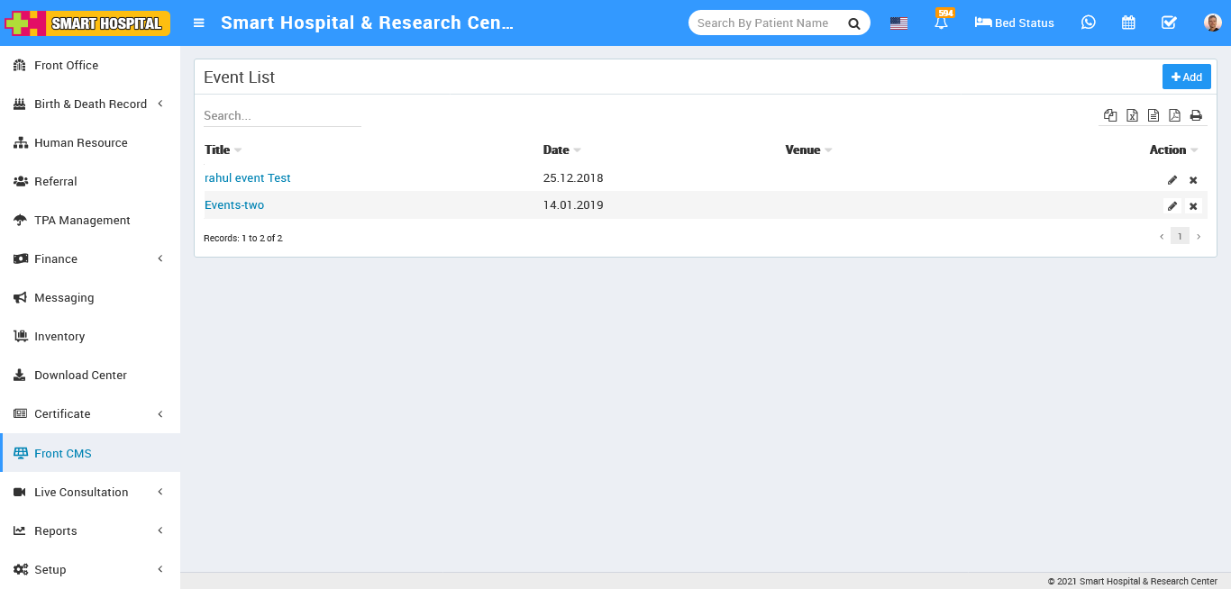 To add event, go to Front CMS then click Down Arrow icon and then click on Add Event button present at top right corner in Page List page. Here you can add all events scheduled past/future in your hospital. To add new event click on + Add button. Here enter Event Title, Event Venue, Event Start Date, Event End Date, Description, SEO Detail Meta Title, Meta Keyword, Meta Description then select Sidebar Setting, Featured Image then click on Save button.