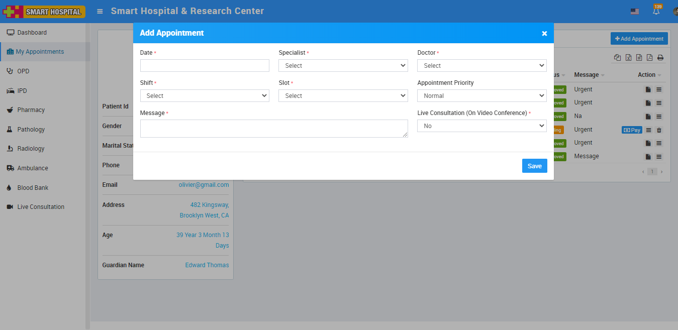 To add appointment from patient account, go to My Appointment. Here click on +Add Appointment button and enter Date, Specialist, Doctor, Shift, Slot, Message, Live Consultation (On Video Conference) and Slots from Slot Available then click on Save button.